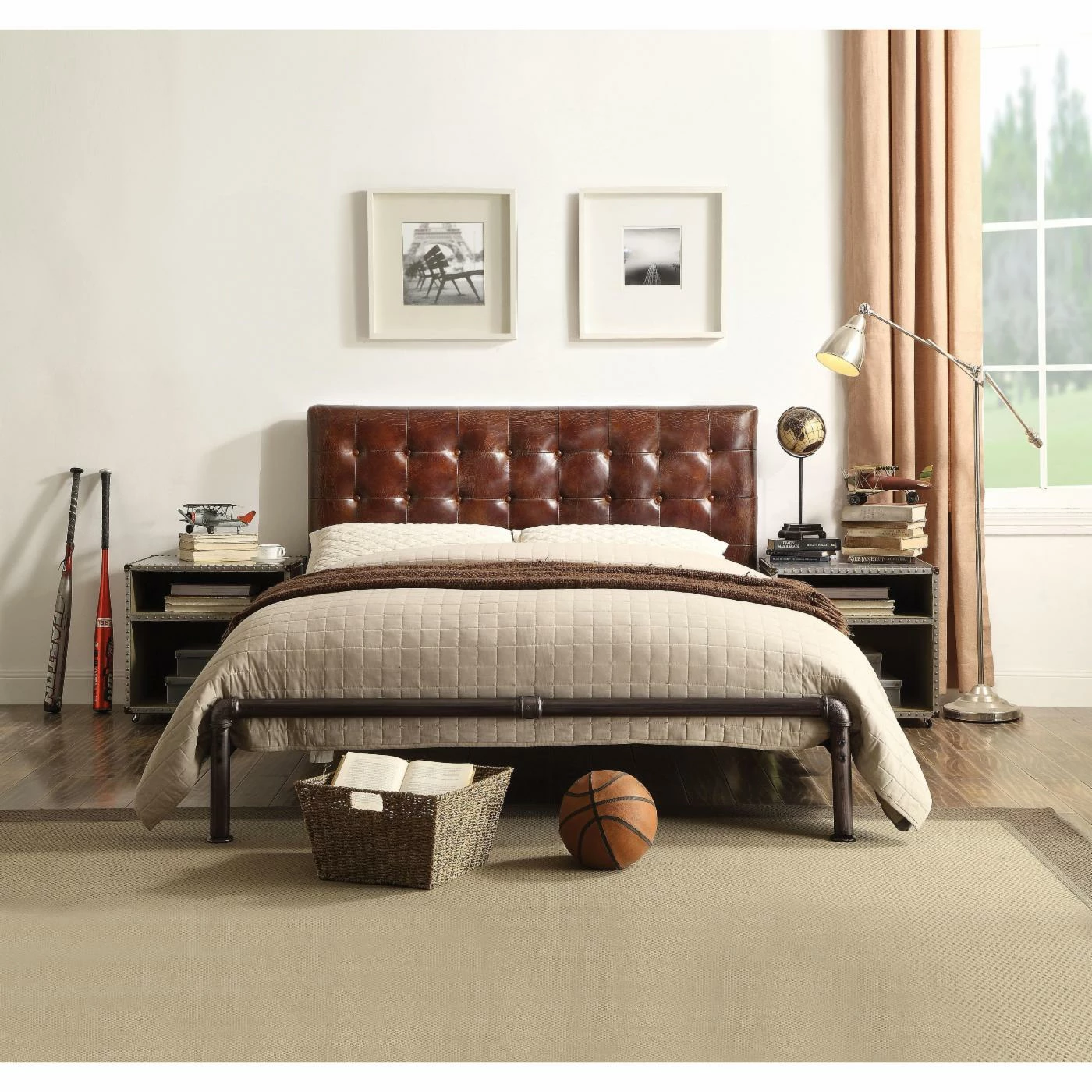 The perfect blend of luxury and rustic industrial style meet in the Acme Furniture Brancaster Queen Bed. Its tall headboard is comfortably padded, upholstered in top-grain vintage brown leather, and deeply button tufted. The low profile footboard has a pipe-fit look. The queen sized bed includes a slat roll, which replaces your box springs.