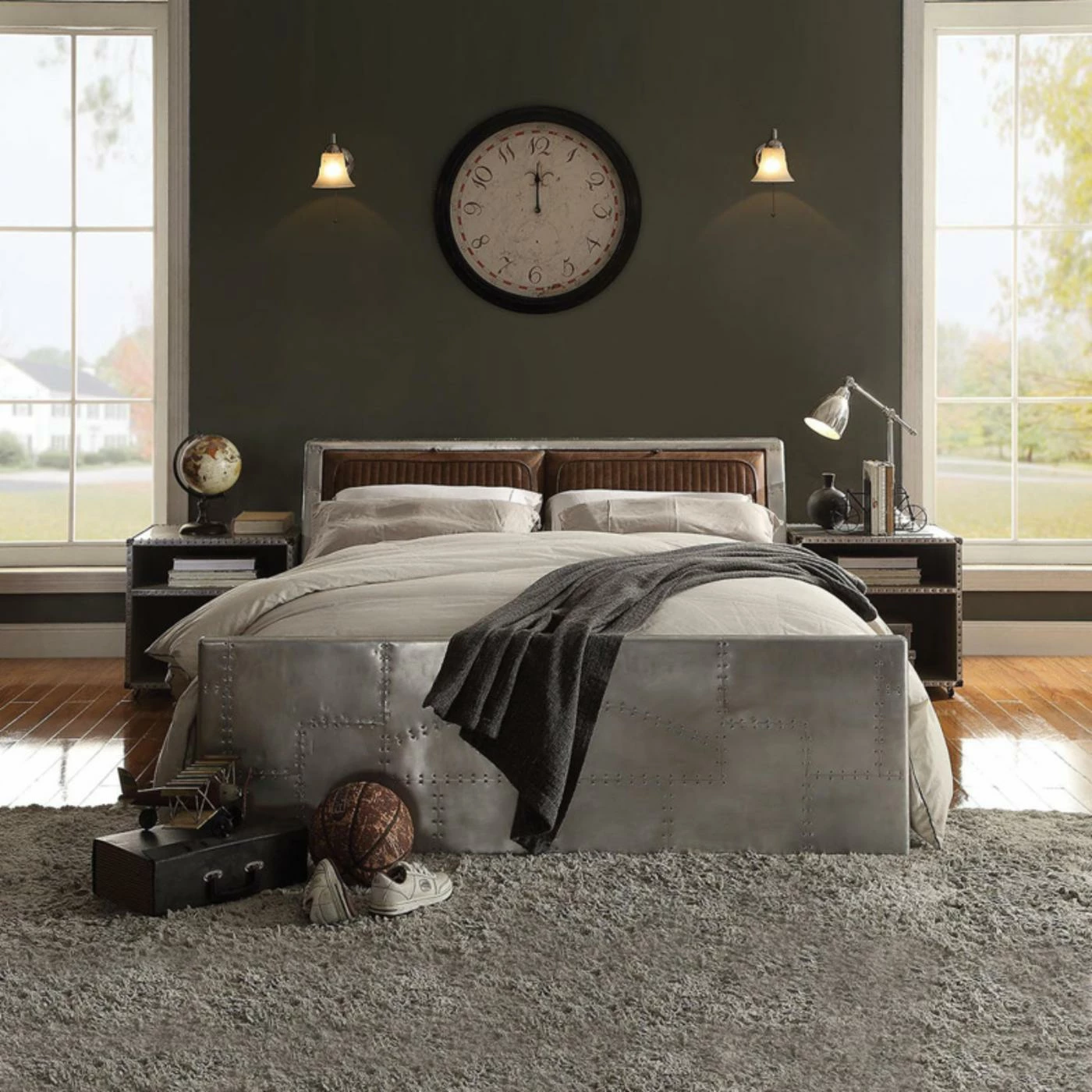Vintage aviation style and tucked away storage make the Acme Furniture Brancaster Queen Storage Bed a bold way to revamp your bedroom. This platform bed features a wrap-around aluminum patchwork frame detailed by rivets. The headboard is graced by top-grain vintage brown leather with storage behind each padded section. This queen sized bed includes a slat roll, which replaces your box springs.
