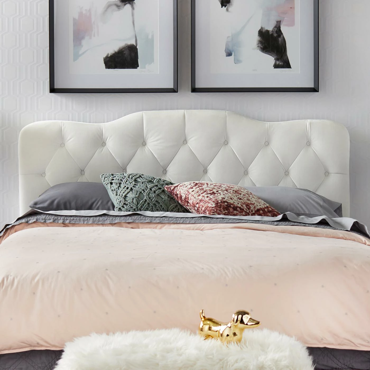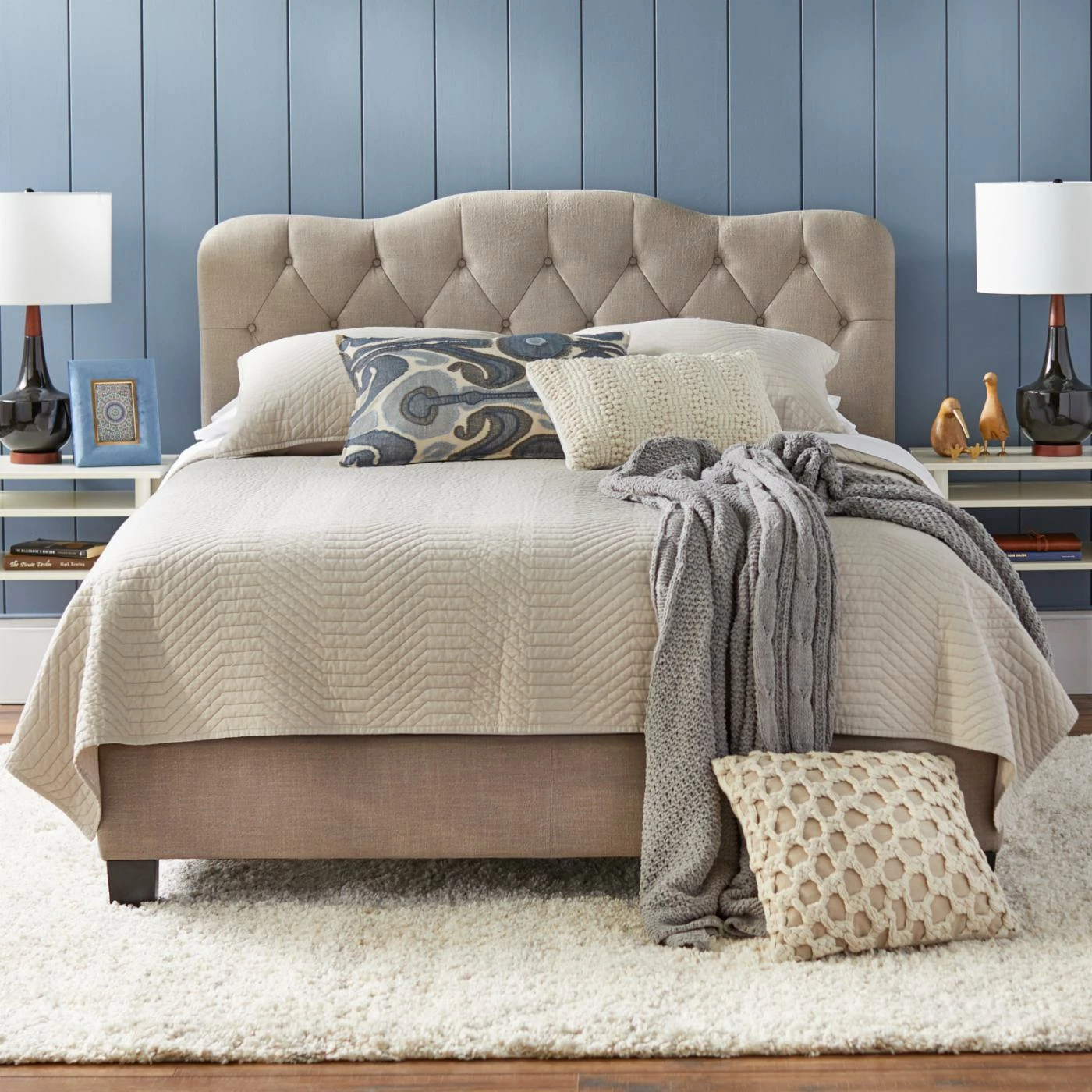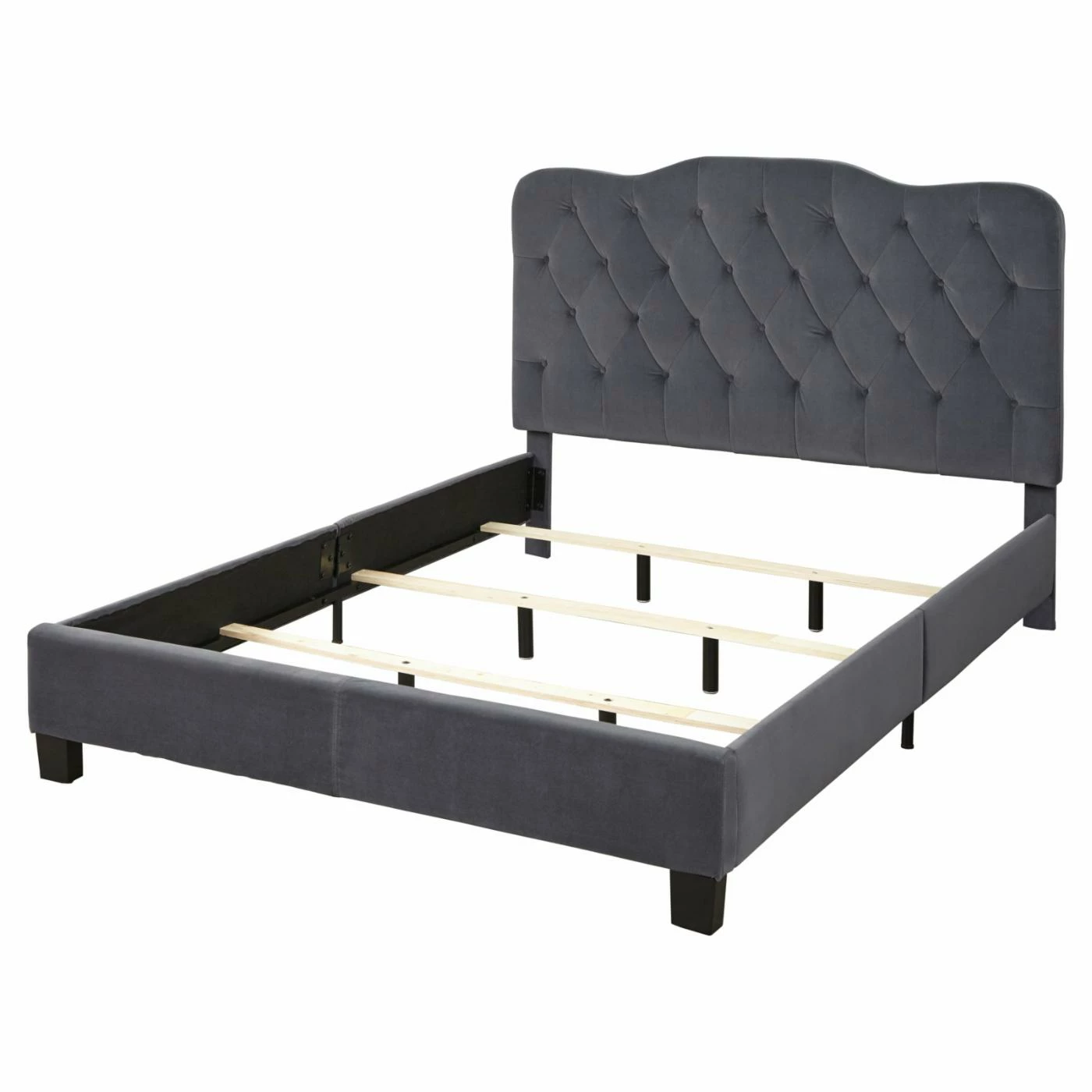 Create a blissful bedroom with the Tessa Upholstered Tufted Panel Bed – Queen. This elegant design features diamond patterned button tufting over plush foam cushioning, luxurious velvet or linen-like upholstery depending on your selection, and sleek black legs. Outfit it with your favorite bedding to customize your look.