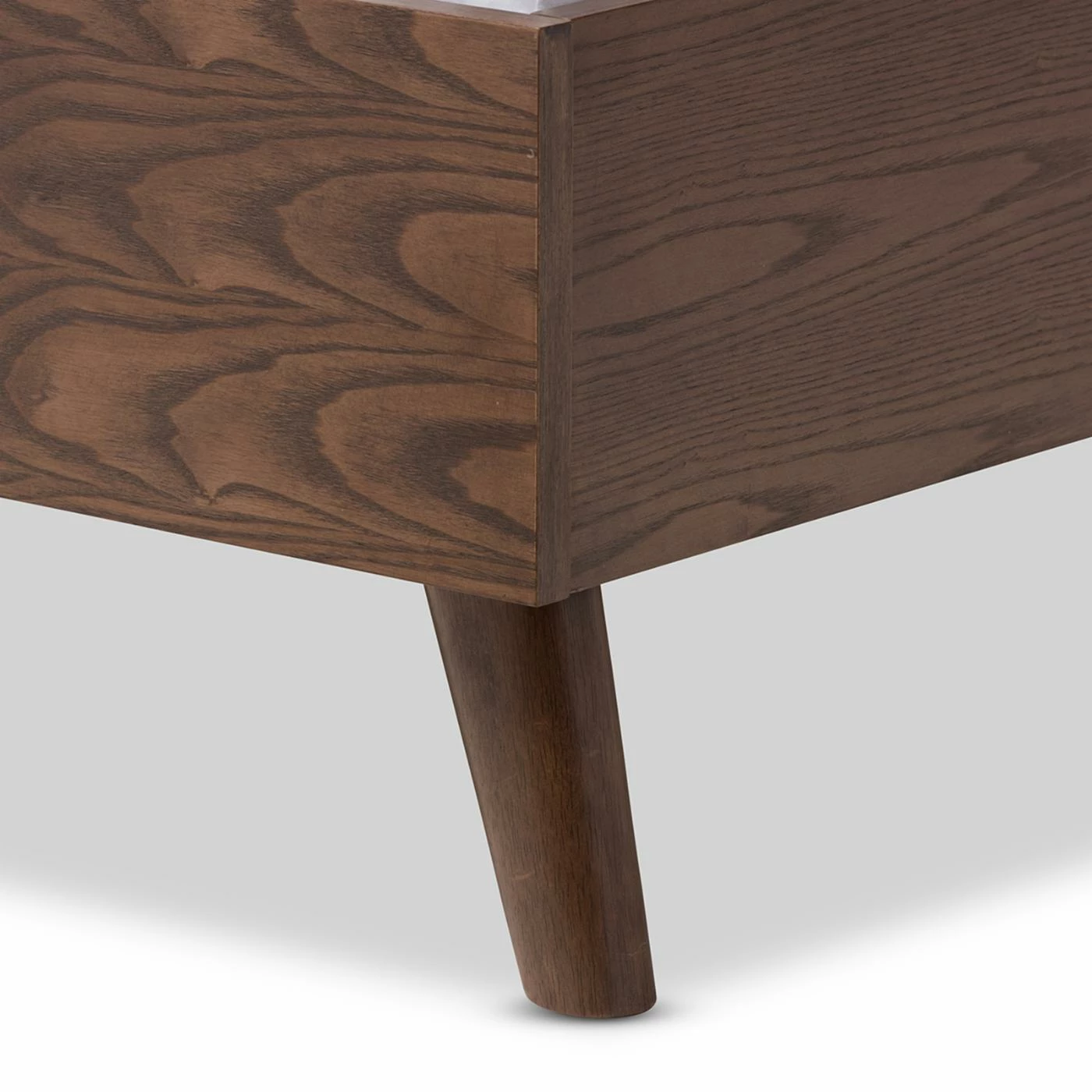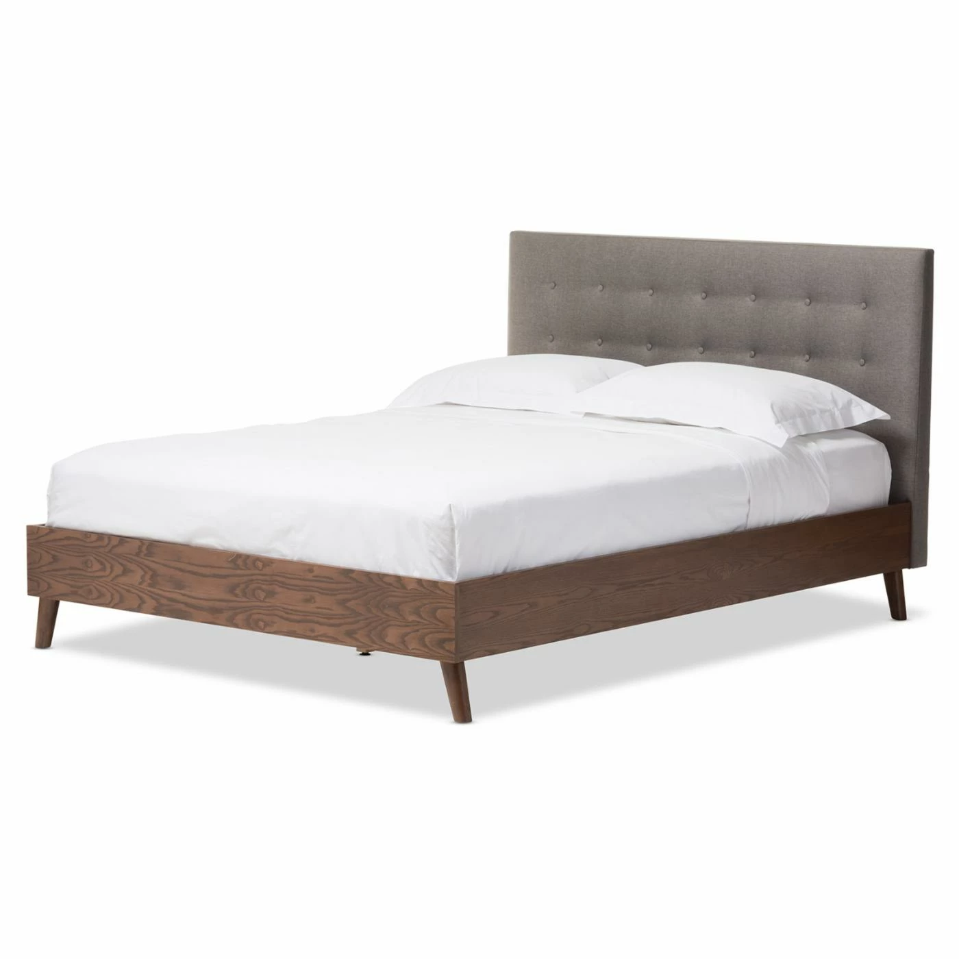 Flared wood legs give the Baxton Studio Alinia Gray Fabric Upholstered Walnut Queen Size Platform Bed a touch of mid-century charm. Its simple rectangular headboard is upholstered in tailored gray fabric and decorated with double rows of button tufts. Walnut wood rails and a low profile wood footboard add the finishing touches to this platform bed. It includes a slat system that replaces traditional box springs. The bed comes in queen size.