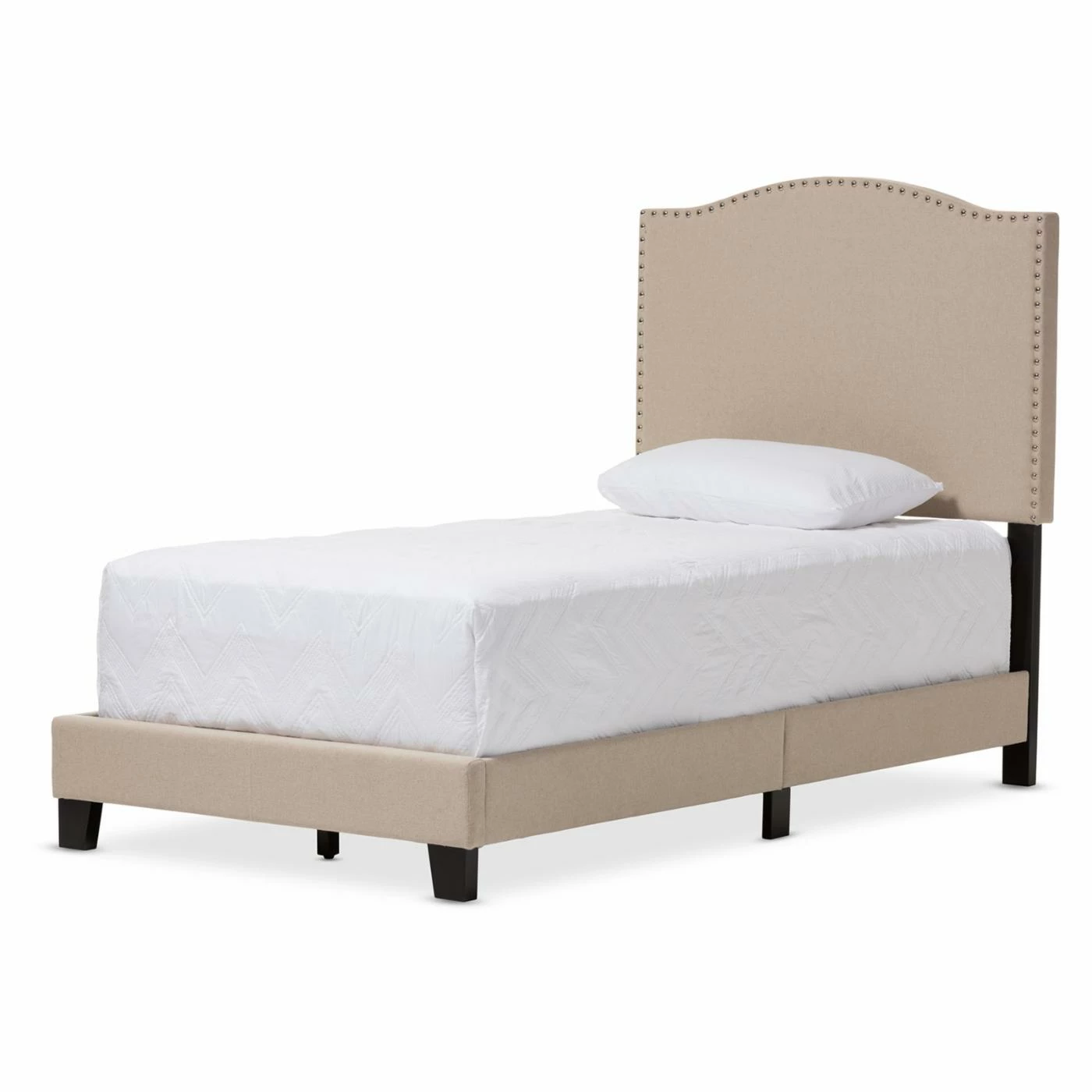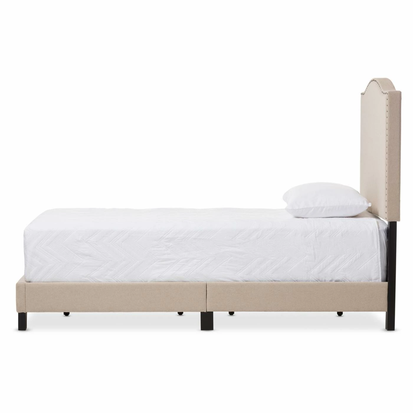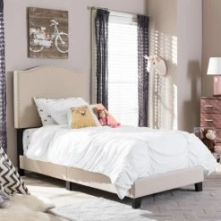 Linen upholstery ensures the Baxton Studio Benjamin Upholstered Twin Size Platform Bed with Nail Heads will work with any bedding color or bedroom design. This versatile platform bed is trimmed in bright metal nail heads for a modern touch. It has a slat system instead of box springs and comes in twin size.