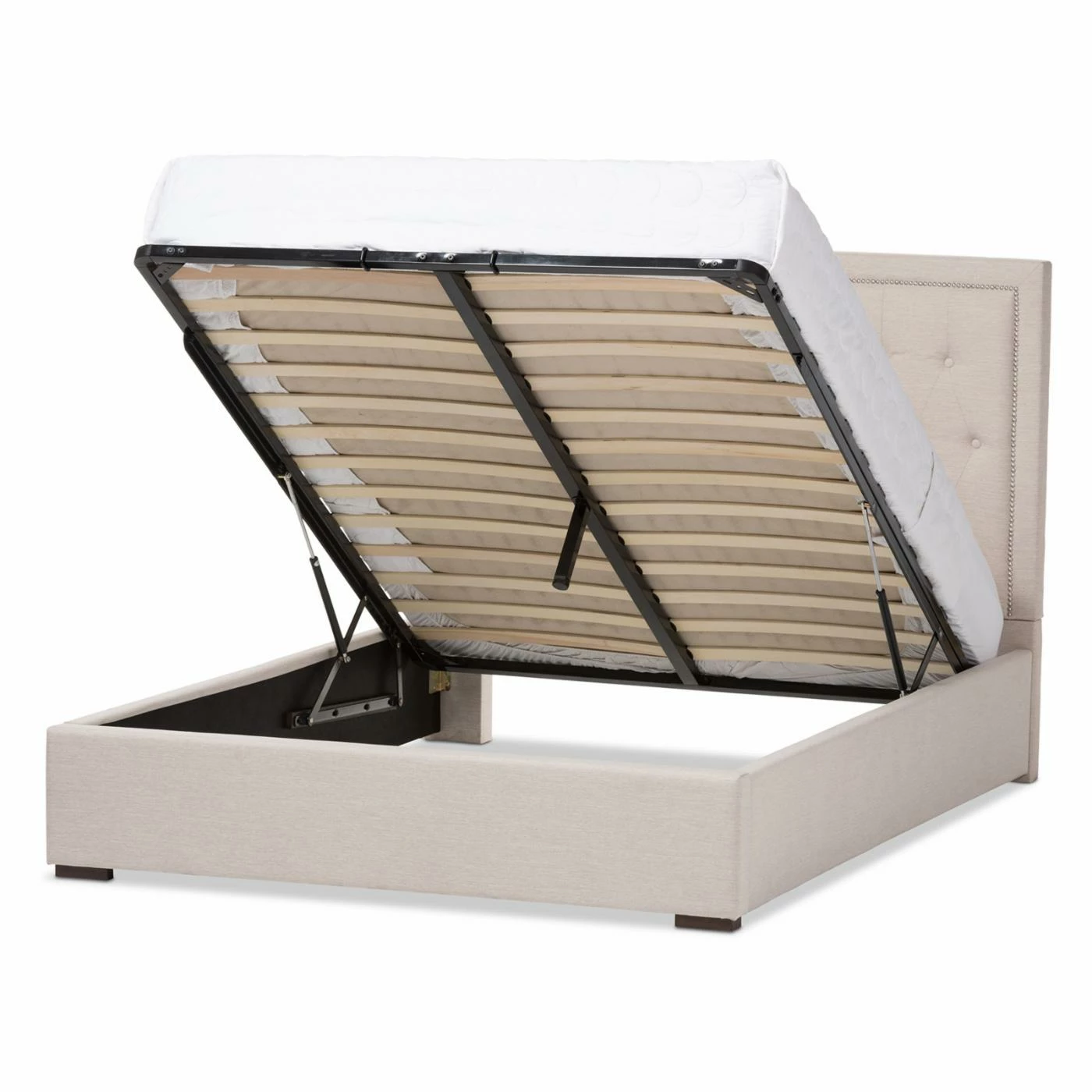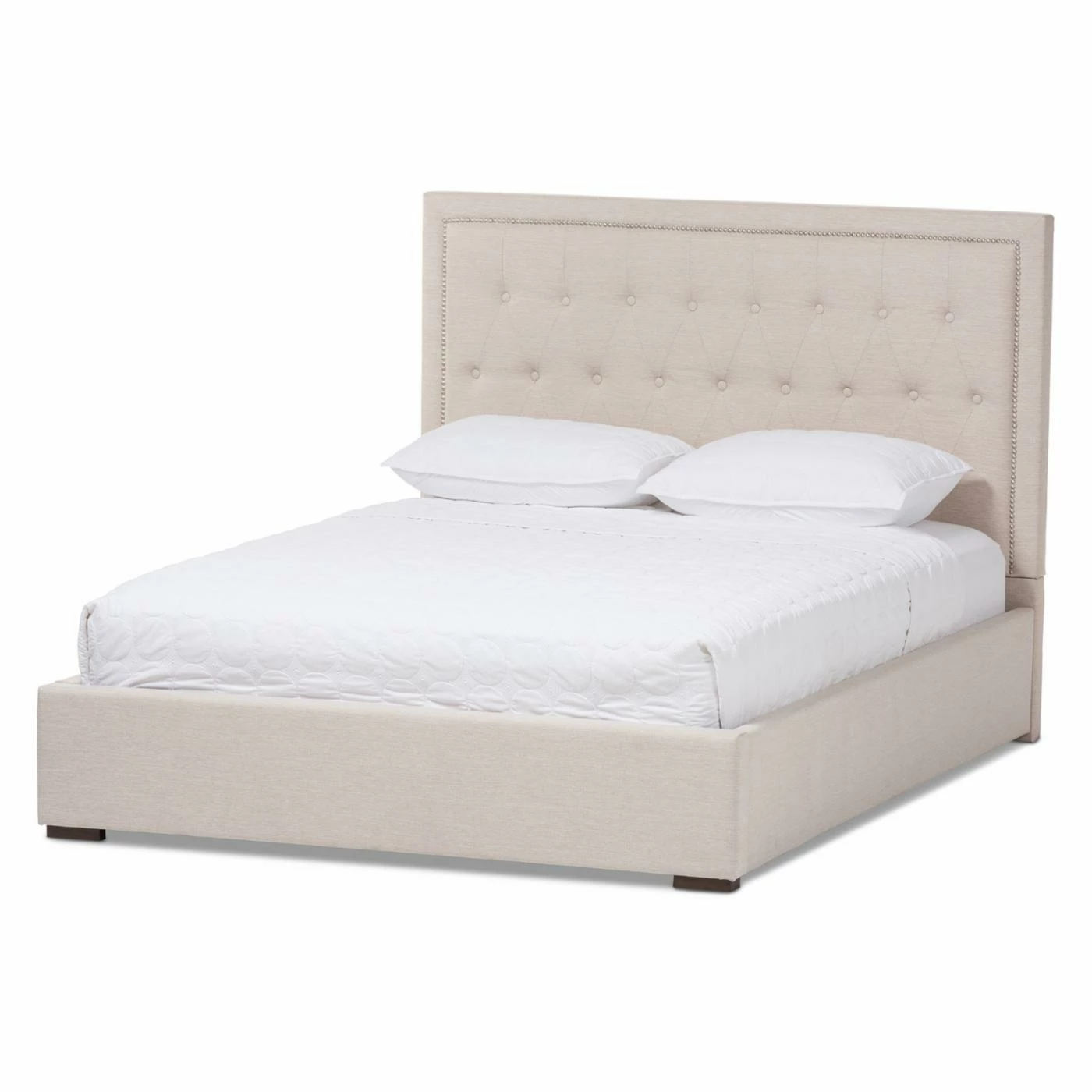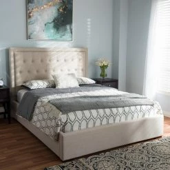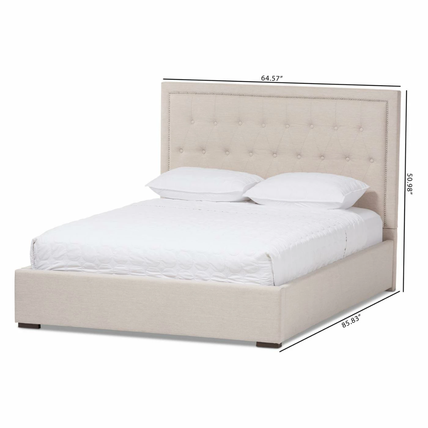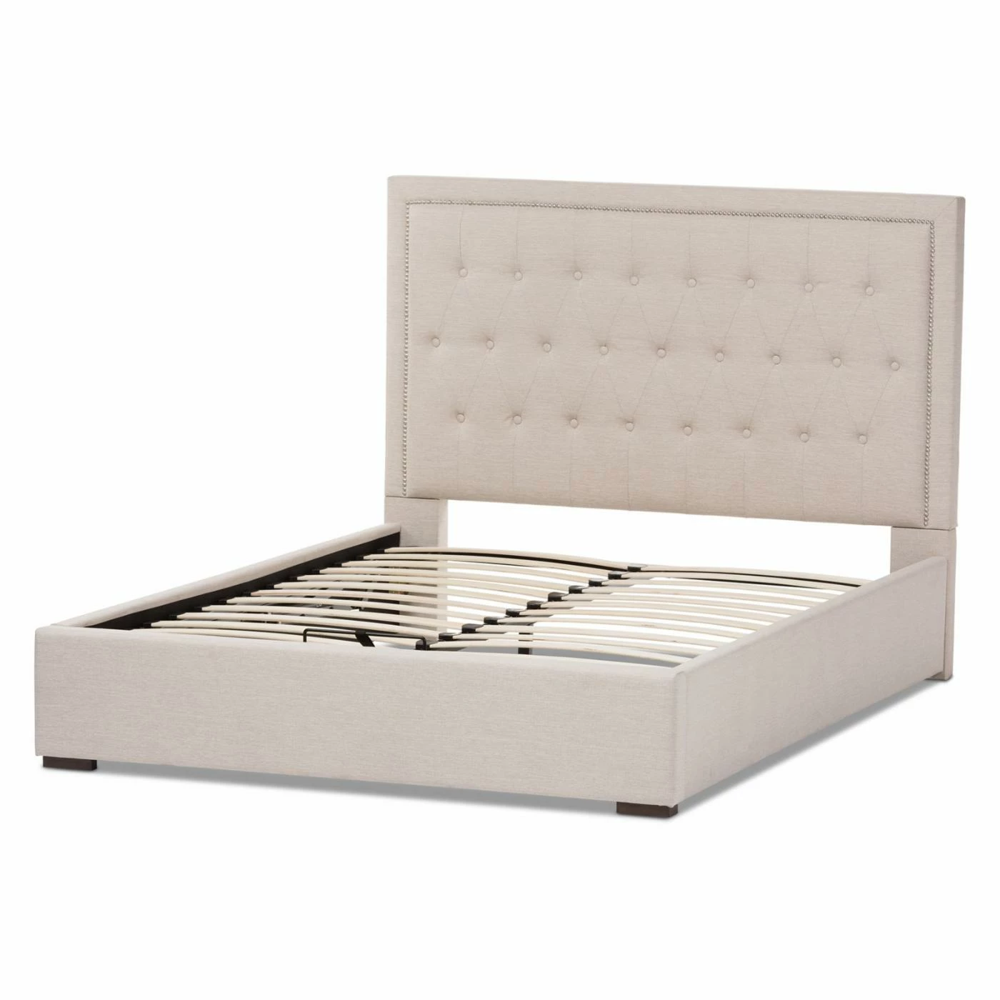 Give your master- or guest-bedroom a versatile and cutting-edge centerpiece in the Baxton Studio Taylor Upholstered Queen Size Gas-Lift Platform Bed. This queen-sized bed frame helps you store away off-season items and more beneath its frame, featuring a gas-assist lift design on the platform that’s easy to lift even with a mattress on board. The frame itself is built from tough and lightweight engineered wood with dense foam padding. 100% polyester fabric upholsters the piece with your choice of available color. The square headboard has a padded center with diamond button tufting and nailhead trim.