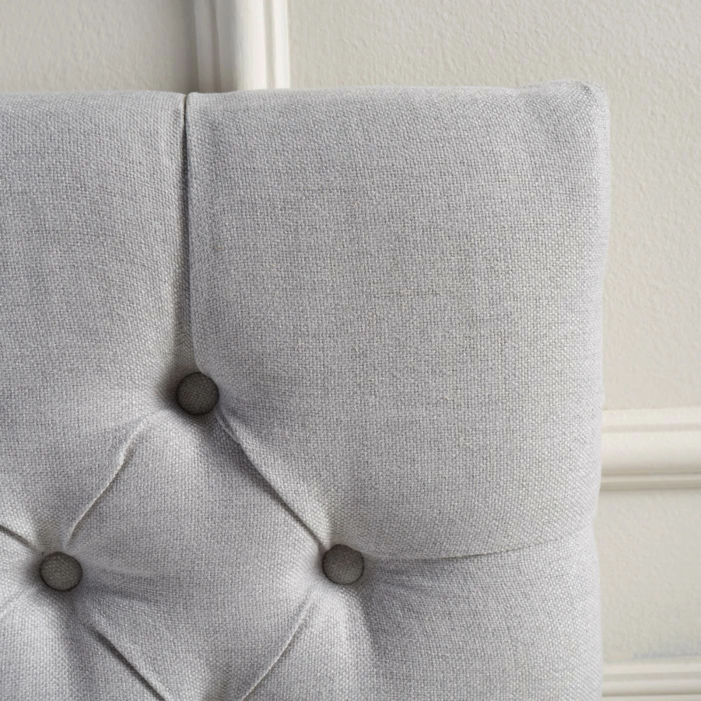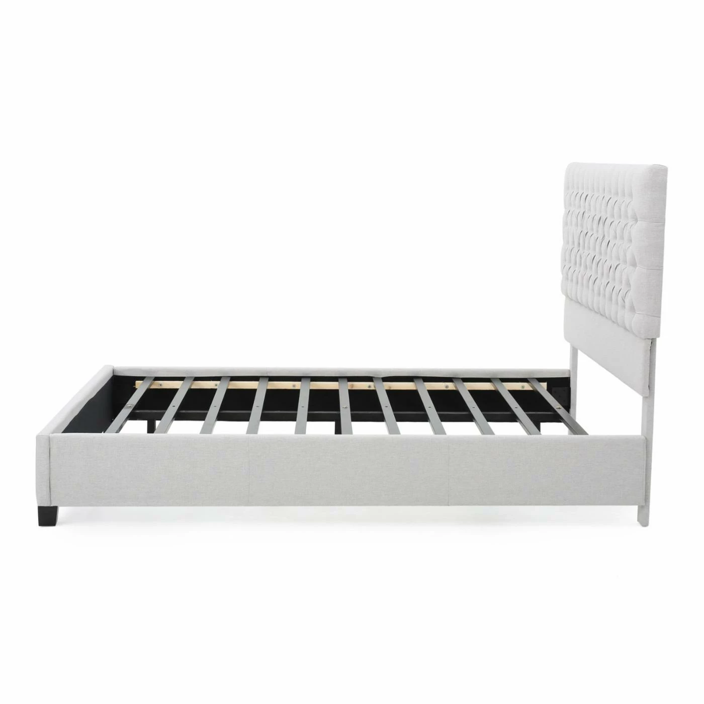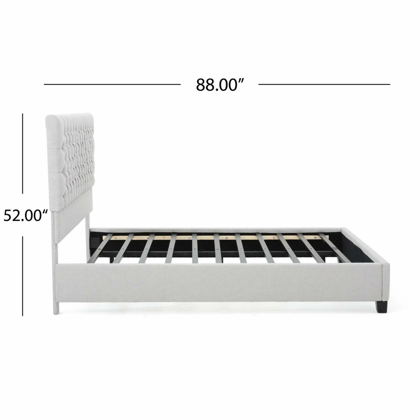 Start a bedroom refresh with the Scout Fully Upholstered Light Grey Queen Bed. This birch wood headboard and frame are covered in soft gray upholstery with elegant button tufting – perfect for formal bedrooms, but casual enough to be dressed down, too. No box spring is required. Simply place your mattress on top of the base slats.