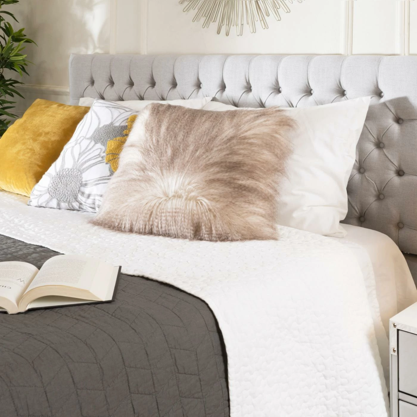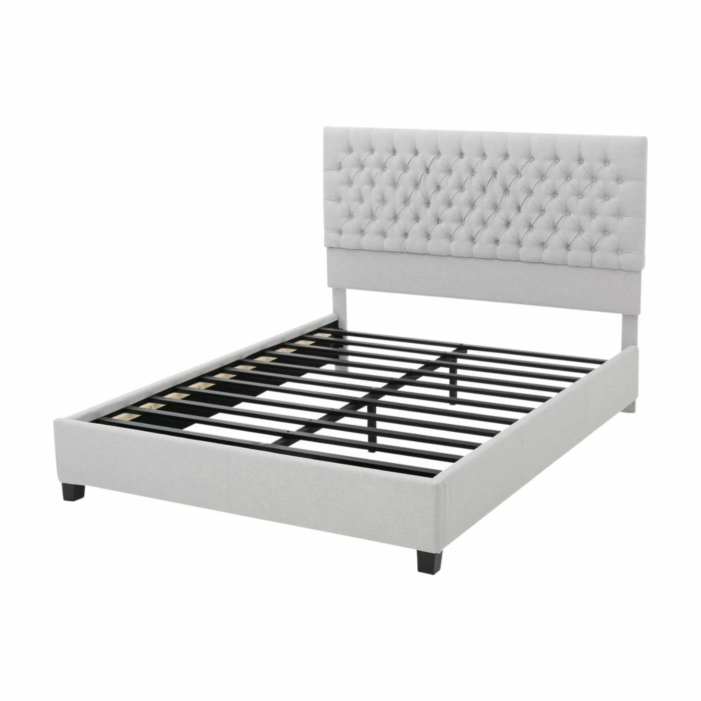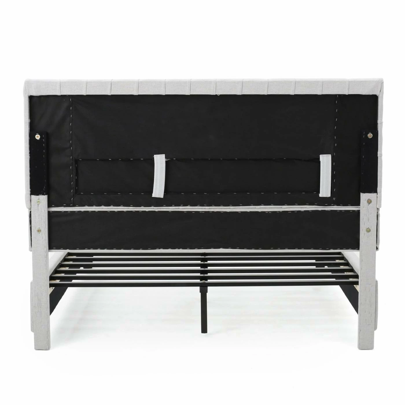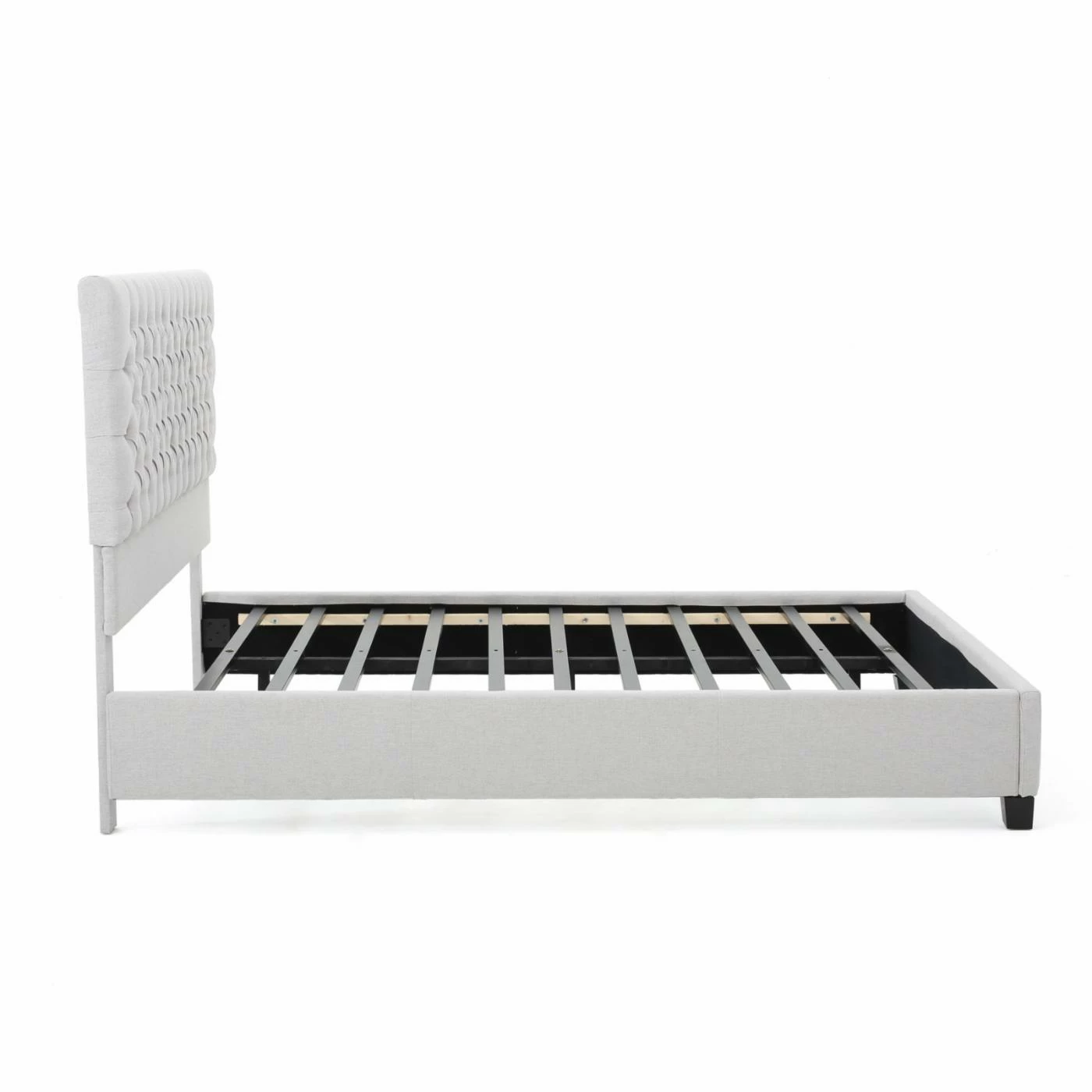 Start a bedroom refresh with the Scout Fully Upholstered Light Grey Queen Bed. This birch wood headboard and frame are covered in soft gray upholstery with elegant button tufting – perfect for formal bedrooms, but casual enough to be dressed down, too. No box spring is required. Simply place your mattress on top of the base slats.