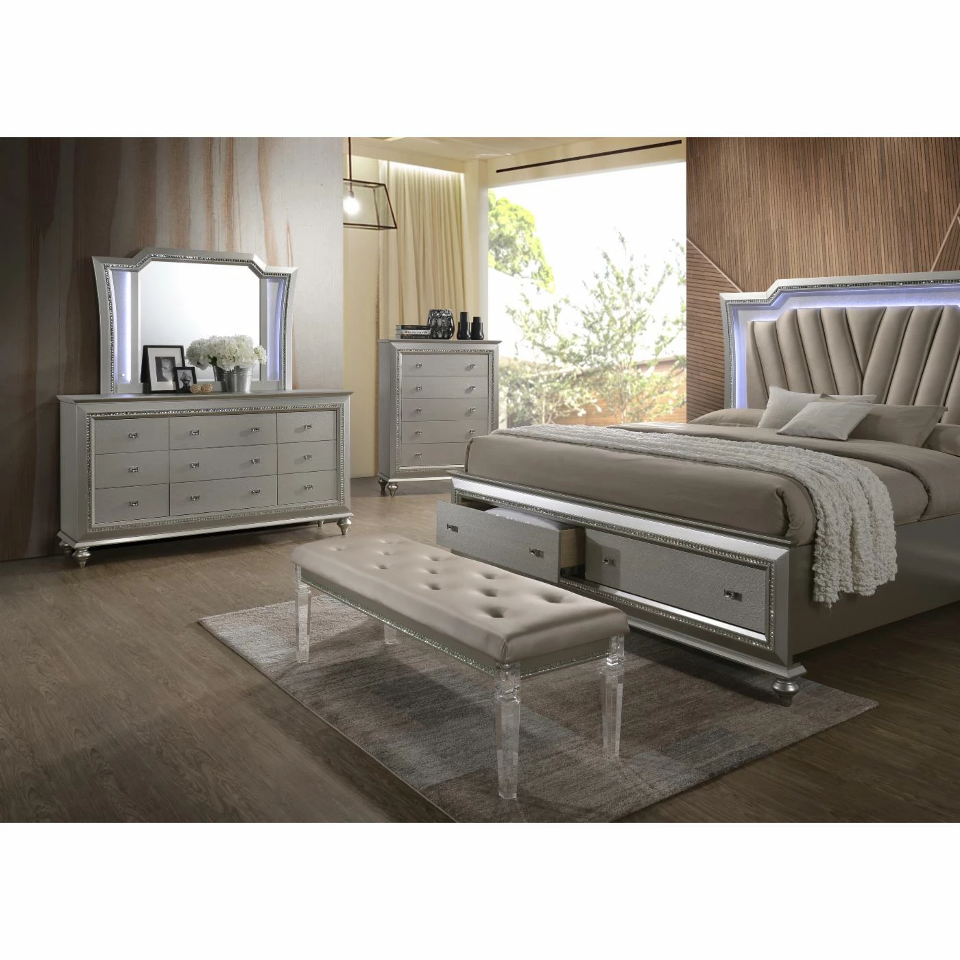 Lend a little sparkle and shine to your bedroom dΓ©cor with the Acme Furniture Kaitlyn Platform Bed. Rhinestones glisten along the headboard and low-profile footboard of the solid wood and engineered wood bed. LED lighting glows around the plush, quilted fabric-upholstered center panel of the headboard, causing the finish to glisten. For convenient storage, the footboard is equipped with two drawers.