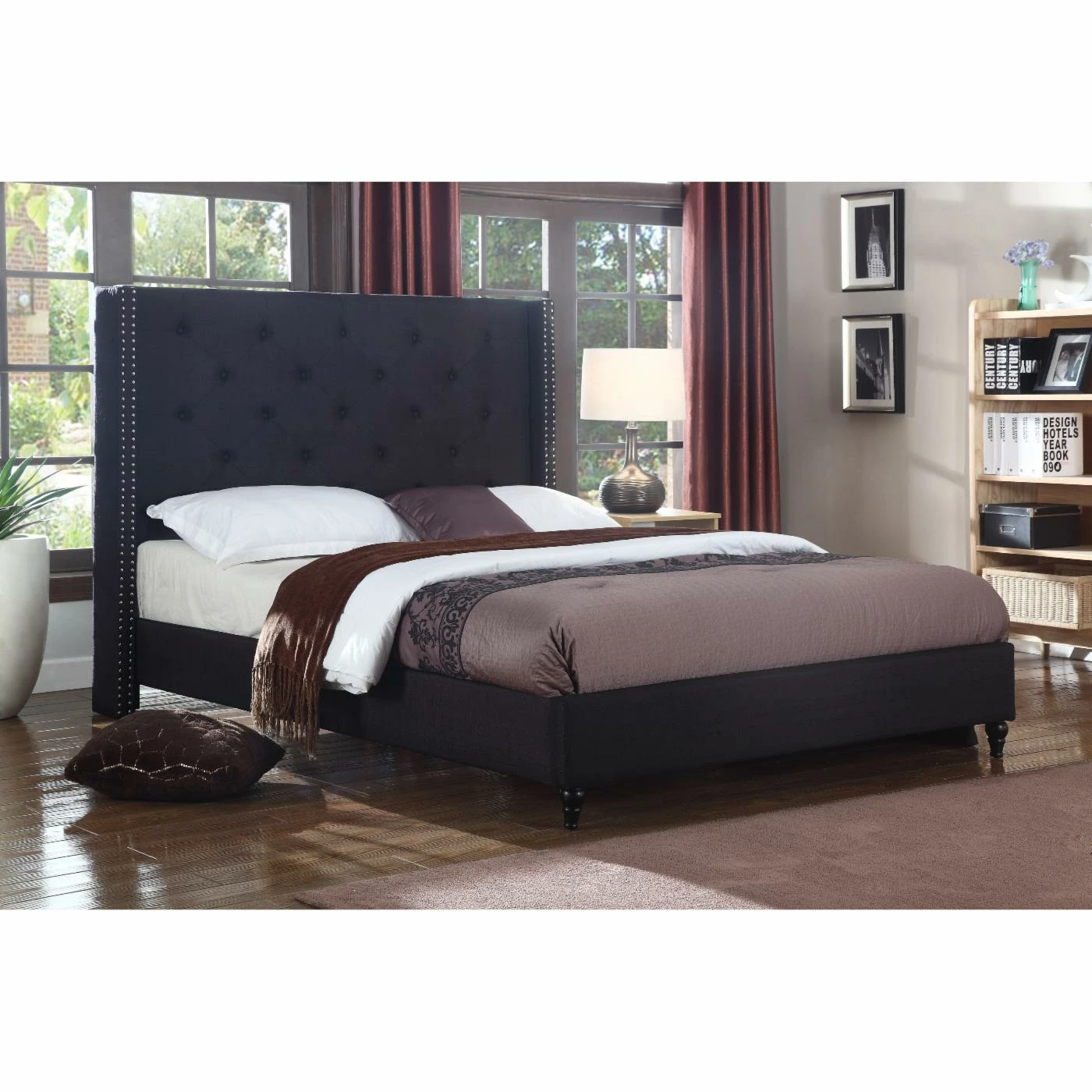 - Tufted headboard in wingback style