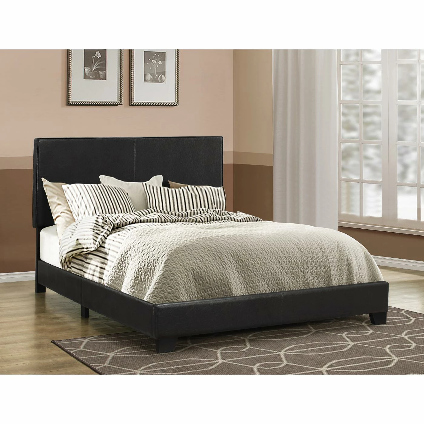 Do away with your big-box bed frame and replace it with the Coaster Furniture Dorian Upholstered Bed. This low-profile bed has a rich color and minimalist look that easily suits a wide variety of decorating styles. Thick pine hardwood constructs the frame, bolstered by engineered wood and block feet. For comfort, every inch of the frame and rectangular headboard comes padded with dense foam. Gorgeous leatherette fabric upholsters the piece. Select from available color and size options.