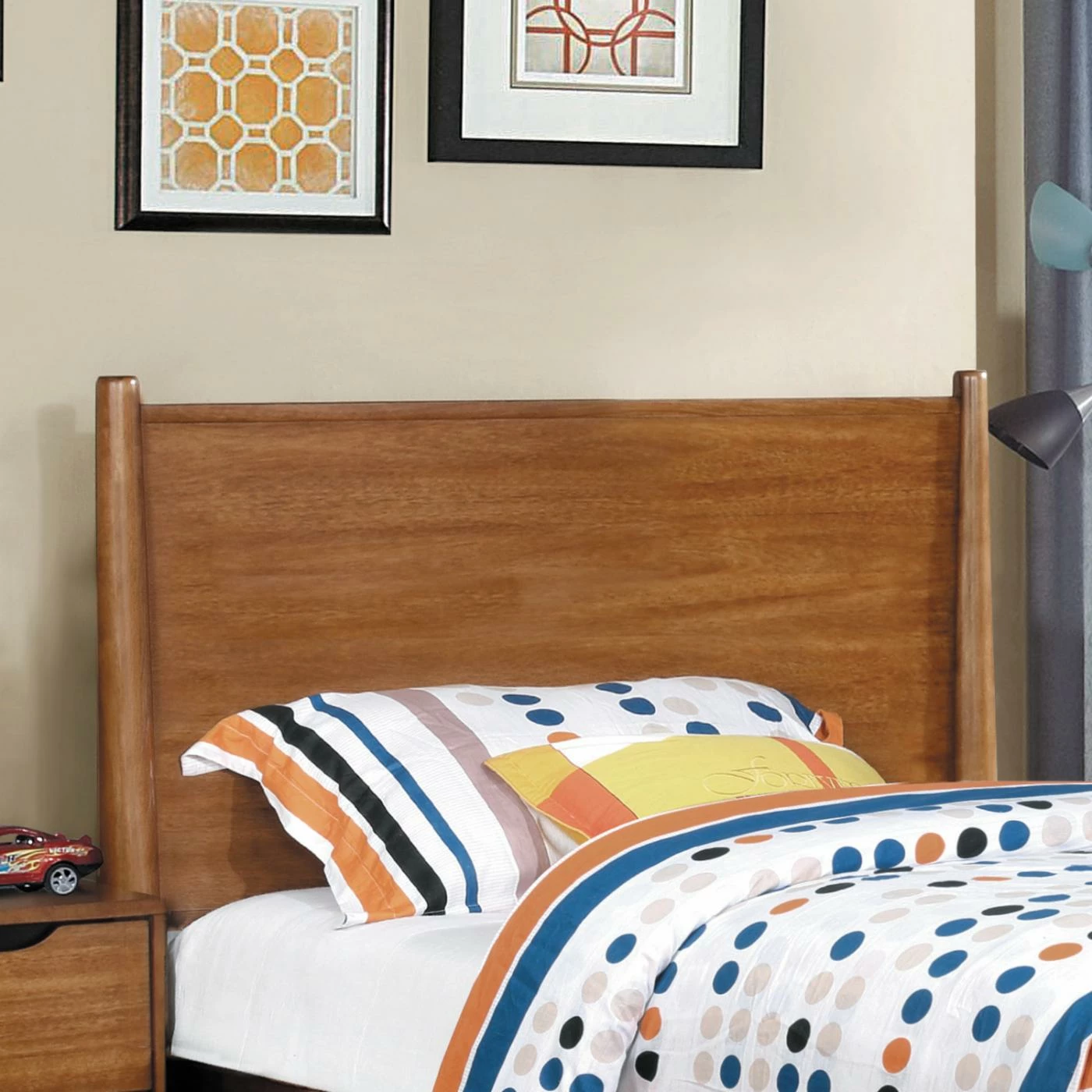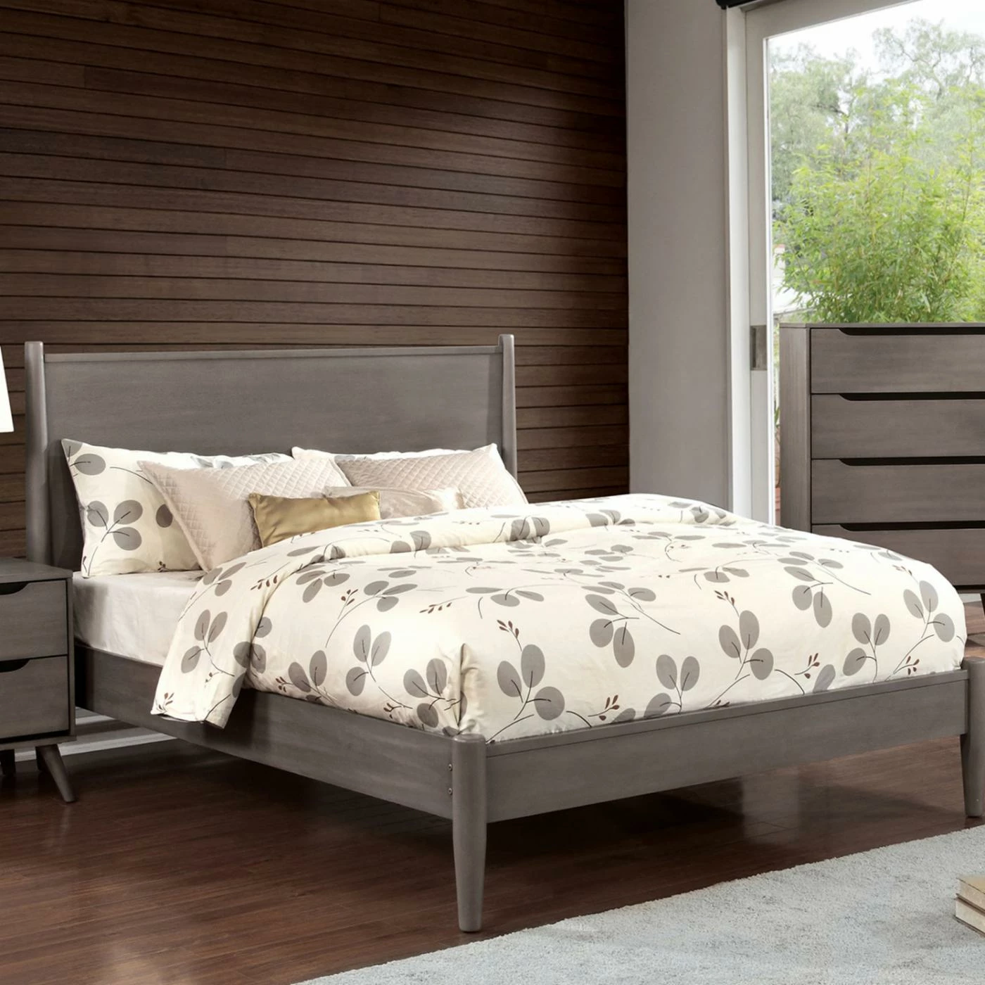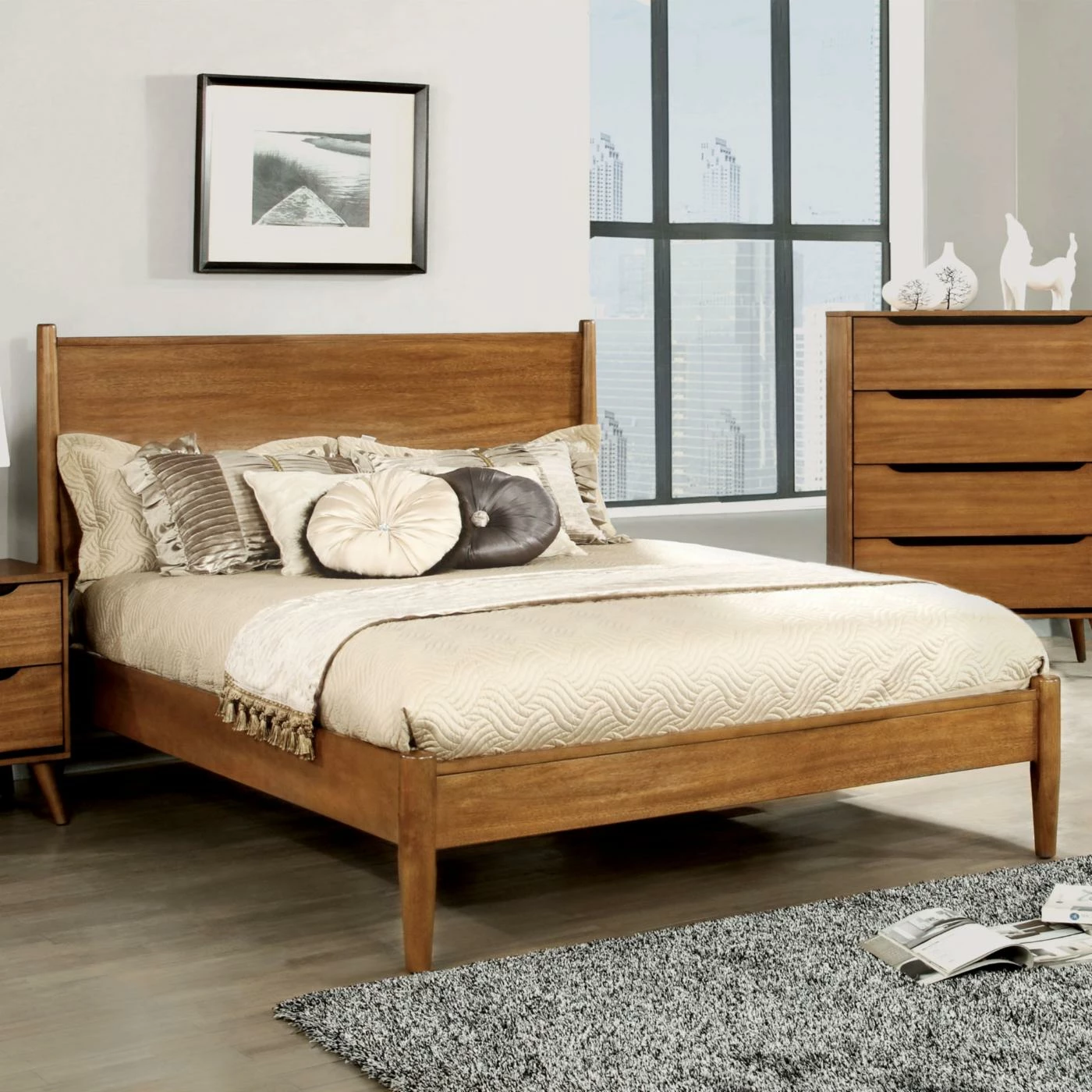 A simple design and wood dowel supports give the Furniture of America Adina I Mid Century Modern Platform Bed its mid-century style. A low profile footboard and rails plus a slat roll foundation update this platform bed. Customize its look by choosing from available finish options. It’s offered in a choice of available sizes.