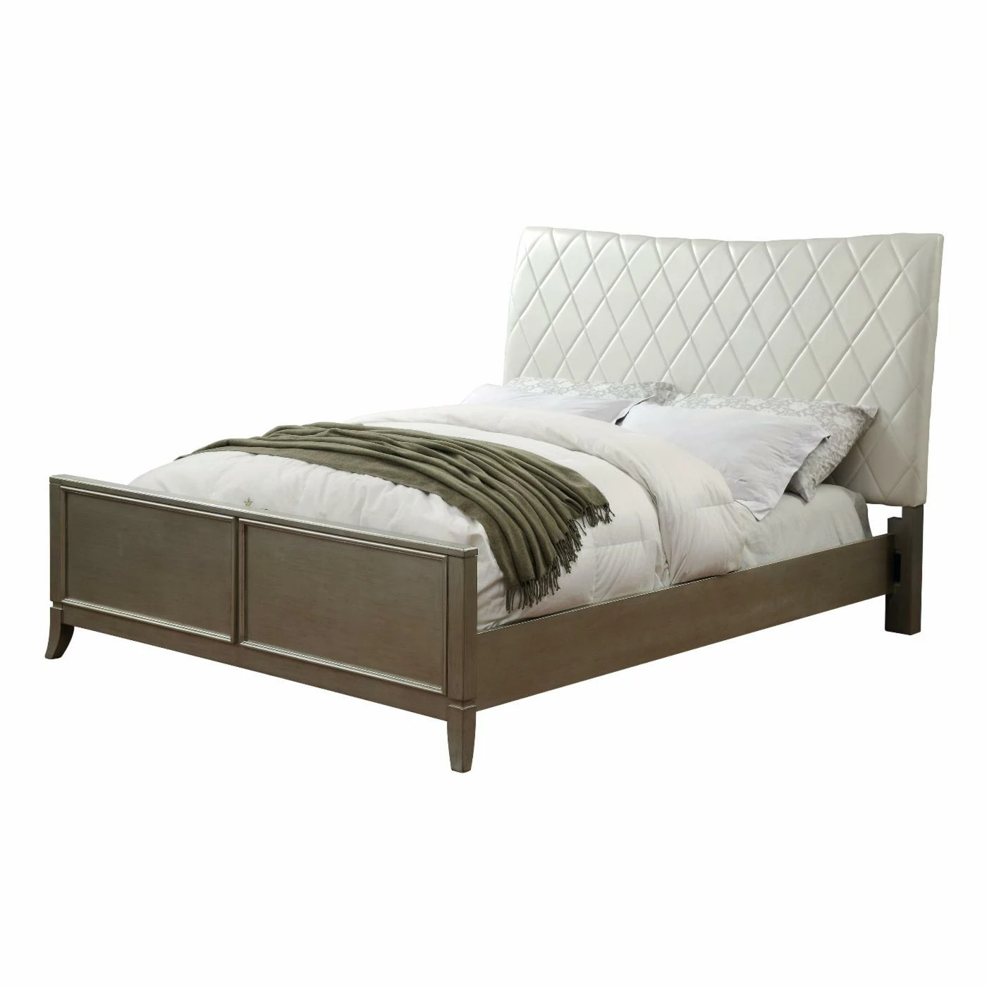 Superior craftsmanship goes into every aspect of this glamorous Furniture of America Lerone Upholstered Panel Bed. Featuring a solid wood and veneer structure, this panel bed boasts an eye-catching silver gray finish. It’s topped with a high profile leatherette, cross-back headboard. Diamond tufting detail on the headboard adds a luxurious element. Silver accent trim around the front panels offer depth and dimension.