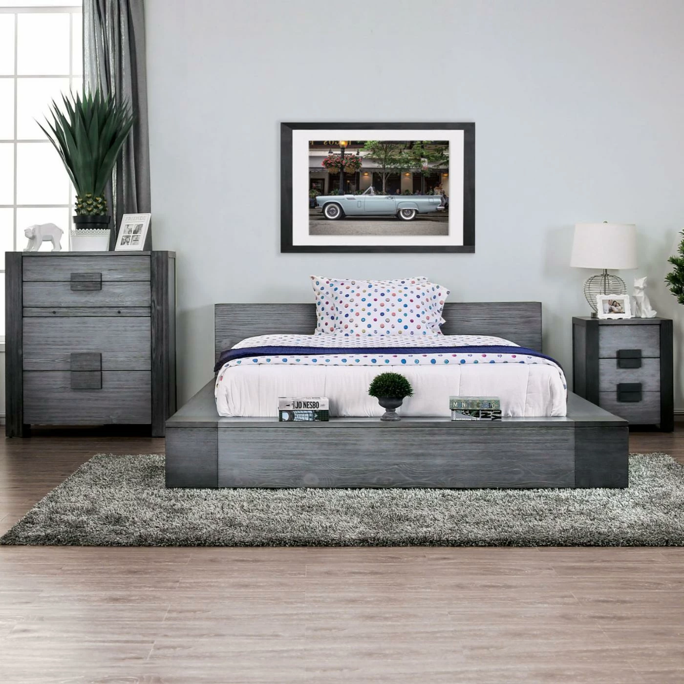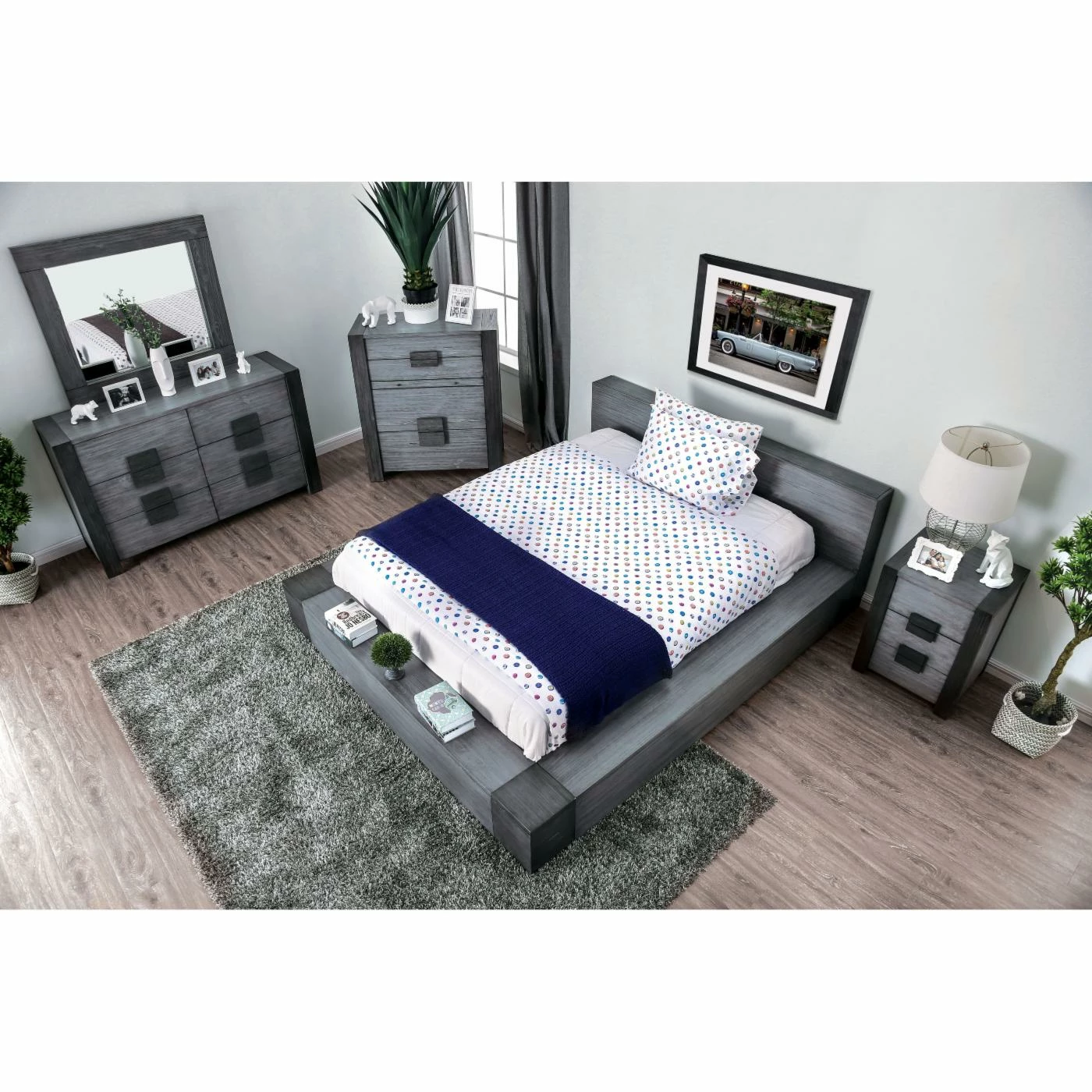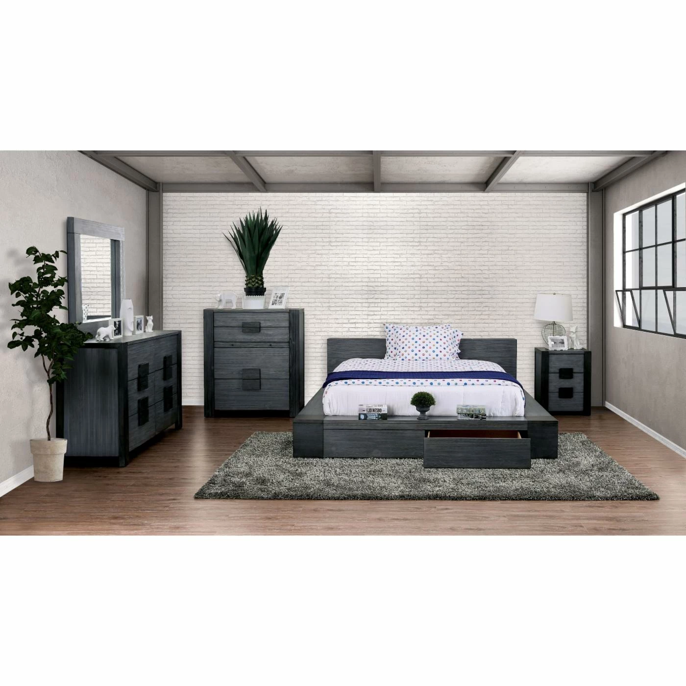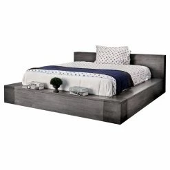 The perfectly urbane Furniture of America Penelope Platform Bed with Optional Storage has a surplus edge for a distinctive look and adds a convenient display space. It also includes two drawers concealed in the footboard so you get extra storage without sacrificing space. To enhance the modern vibe of this platform bed, it comes in a cool gray wood grain finish with dark gray accents. It doesn’t require a box spring and comes in your choice of available sizes.