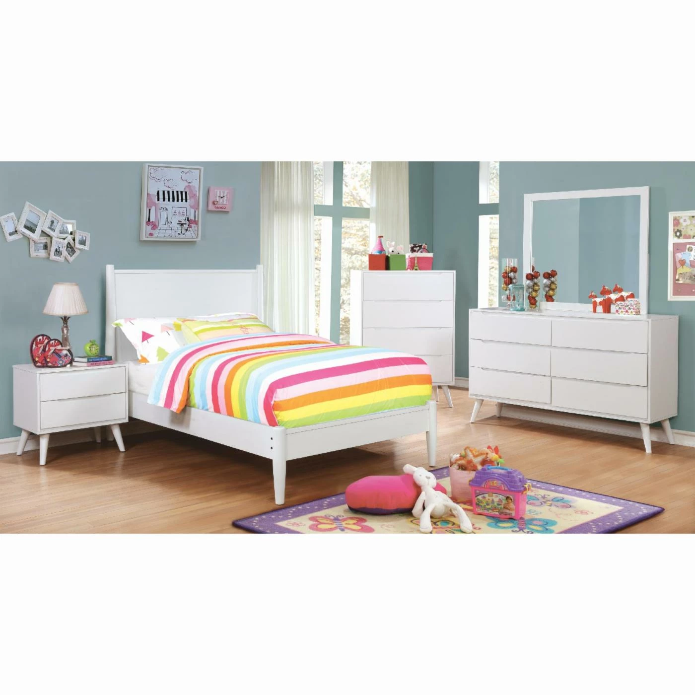 The Furniture of America Stewart I Mid-Century Modern Wooden Flat Panel Platform Bed offers you an exciting new option to better outfit your master- or guest bedroom. Tough, thick wood is used to craft this piece, featuring a slat platform that needs to box spring. Round tapered posts support the headboard and footboard, which feature a simple rectangular look. High-quality veneers overlay the wood, finished in a refreshing white. Choose from available sizes.
