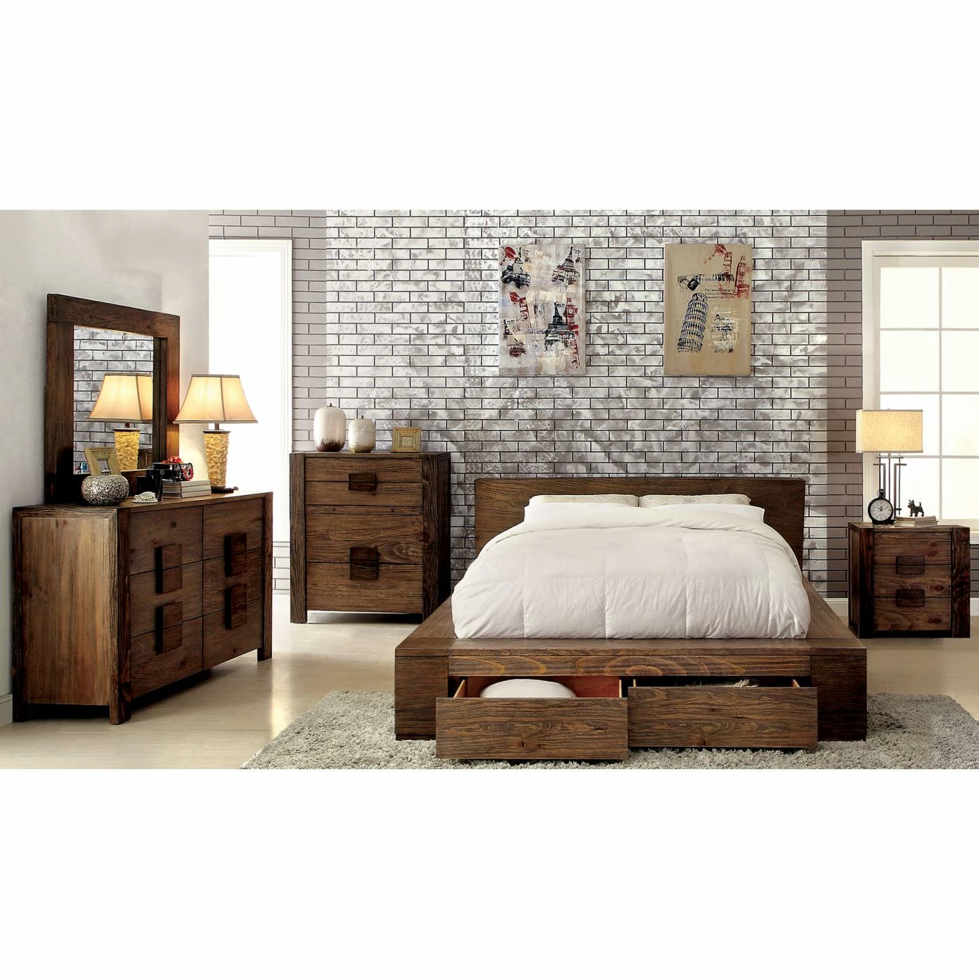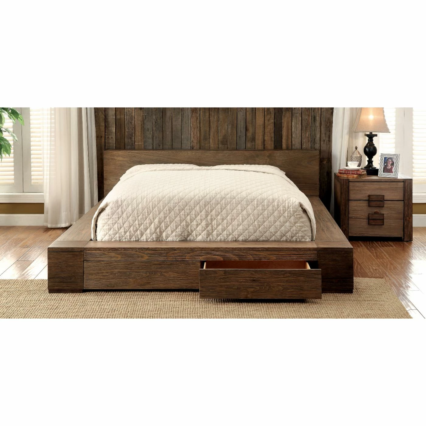 Contemporary in its sleek design, this Furniture of America Titania Platform Storage Bed is more than just a cozy bed. It boasts 2 handle-less metal glide footboard drawers for convenient storage space. Made of solid wood and veneers, this bed features darkened block accent corners for alluring detail. A rustic natural finish underscores the unadorned and simple aesthetic. It’s equipped with a low headboard and also includes a slat kit with support legs.