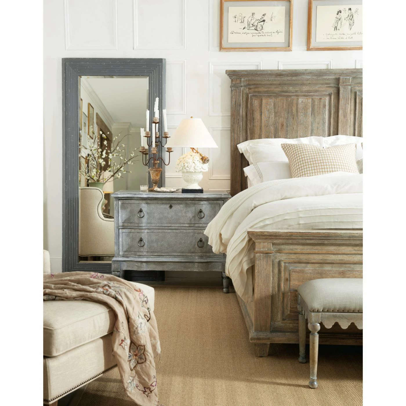 The Hooker Furniture Boheme Laurier Panel Bed brings sophistication and warmth to your master- or guest-bedroom. This bed is made from solid poplar wood with block feet and white oak veneers. The wood surface is distressed for a weathered look, accentuated by a milk-paint whitewash finish. Both the headboard and footboard feature flared crowns and framed, molded panel details. Choose your ideal size option from the available.