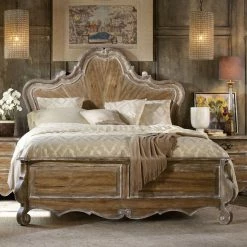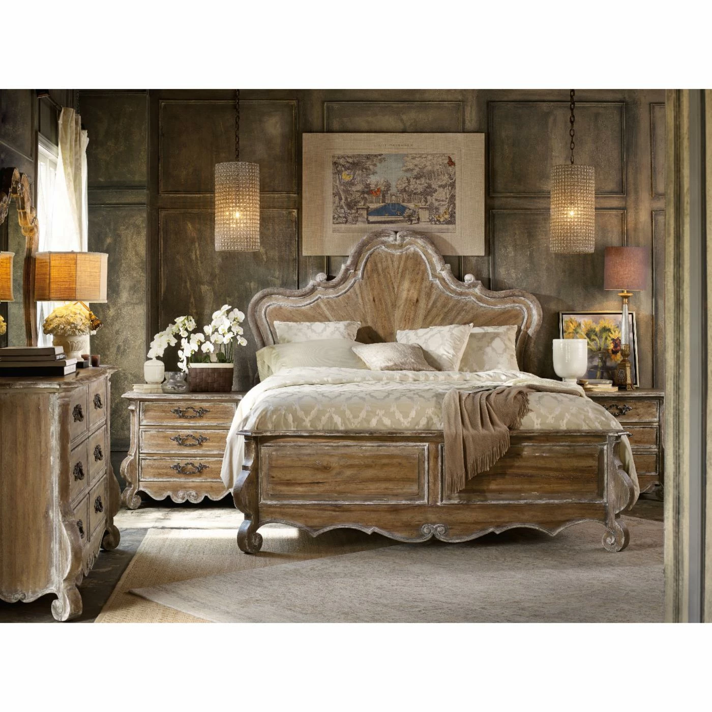 Build an old world farmhouse feel in your bedroom with this Hooker Furniture Chatelet King Wood Panel Bed. Designed to be a centerpiece, this panel bed boasts a grand headboard with elaborately carved, generous moldings and detailed pecky pecan veneers. The footboard has a low profile, canted and scrolled corner posts, and a carved base rail. This bed is crafted of poplar and hardwood solids with pecky pecan and cedar veneers. It comes in an artfully distressed finish with soft amber pecan touched with aged white paint to enhance the antique feel. Choose from king size options.