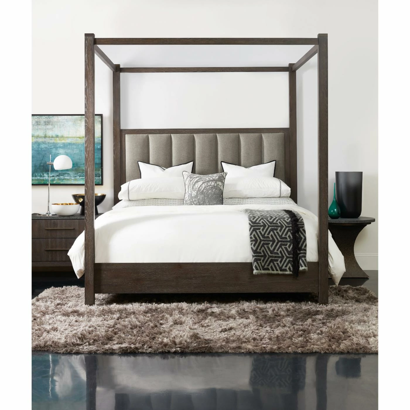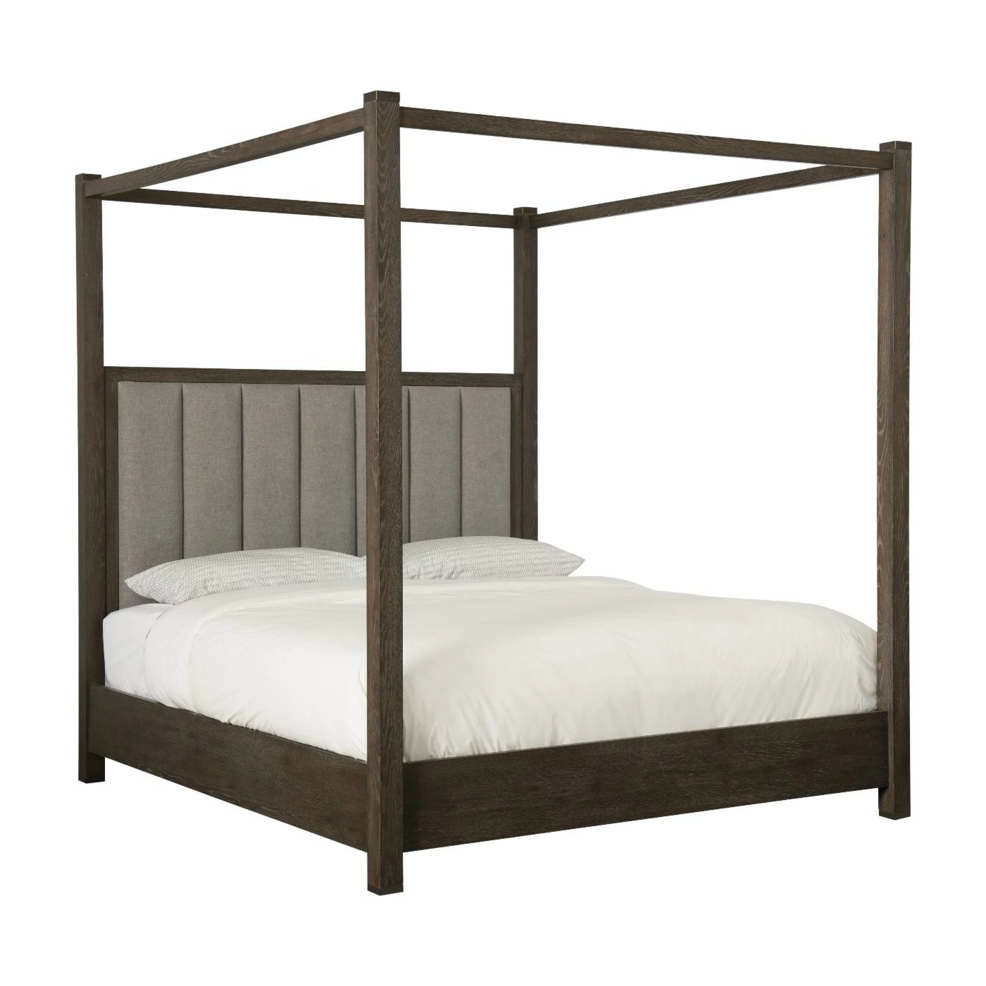 The Hooker Furniture Miramar Aventura Jackson Canopy Poster Bed gives your bedroom a resort-worthy look that you won’t have to travel far to enjoy. This poster bed is constructed of rubberwood solids and covered with white oak and pine knotty veneers. It’s covered in a rustic oak finish that’s easy to pair with existing bedroom furniture. The headboard is upholstered with polyester fabric in a cement gray color, and the fabric is accented with channel tufting. Pair this bed with other items from the Miramar Aventura Collection for a coordinated space.