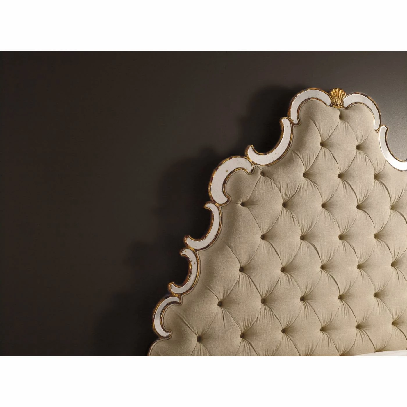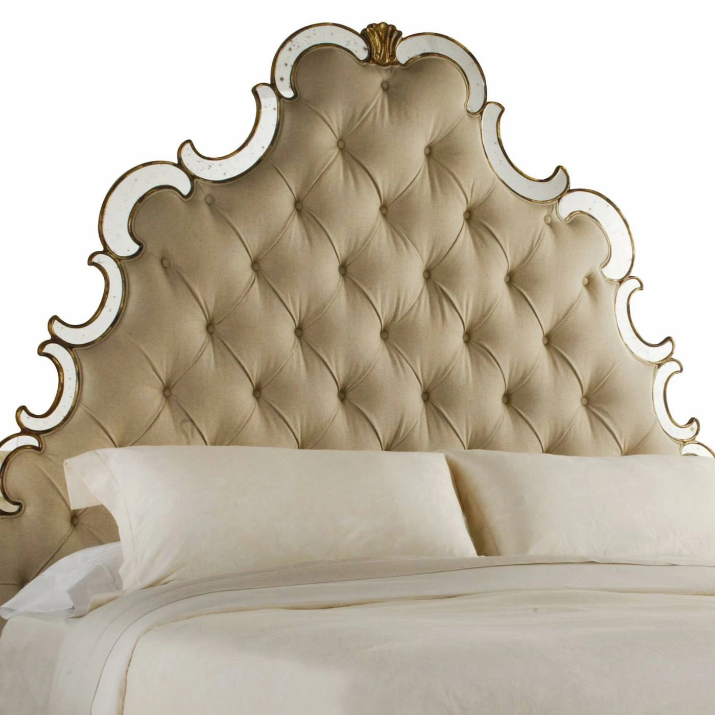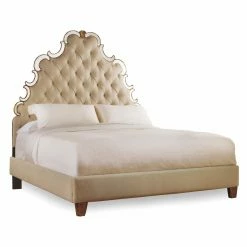 Rest secure in the knowledge your bed is the most opulent one on the block with the Hooker Furniture Sanctuary Tufted Mirrored Bed. Perfect for your private haven, this dramatically tall upholstered headboard is edged in curling sections of antiqued mirror. It’s the ideal mix of luster and plush comfort. The footboard and rails are also upholstered in matching beige linen fabric. Tapered wooden block feet complete the look.