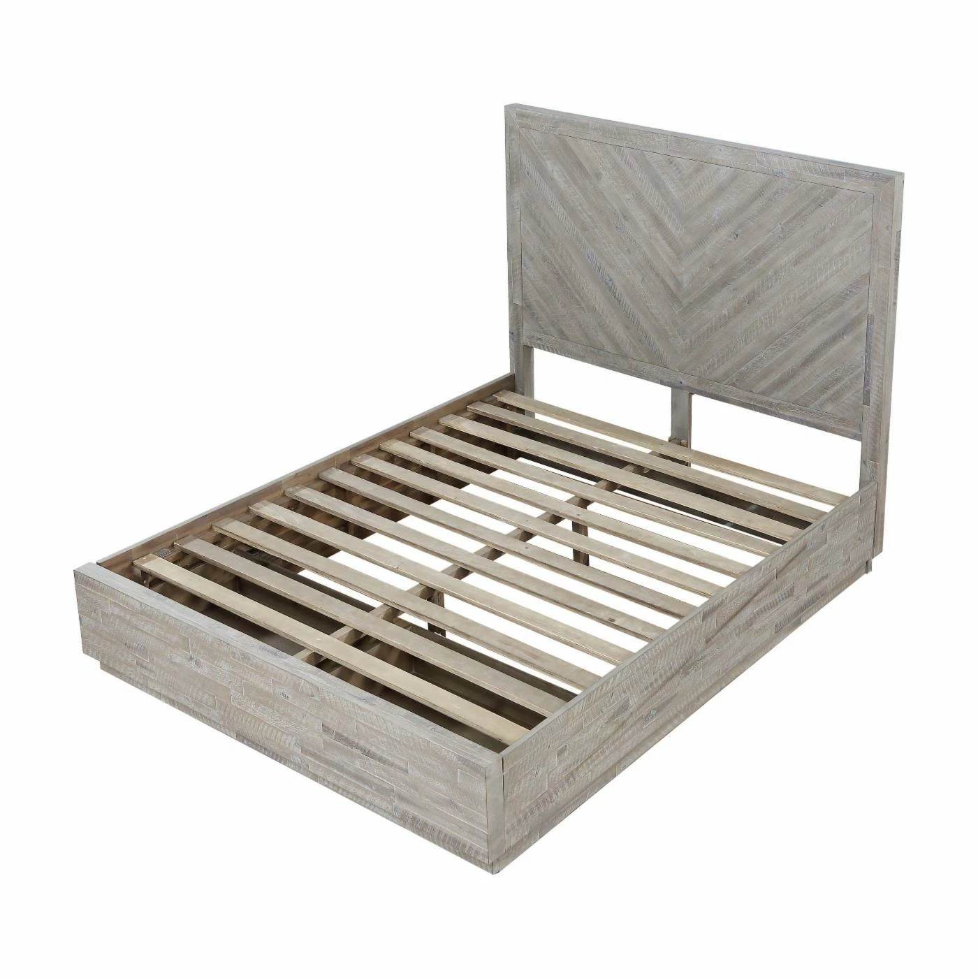 Elevated style paired with organization arrives to upgrade your bedroom with the Modus Alexandra Solid Wood Storage Platform Bed. The footboard features two storage drawers with side pull handles for your extra blankets, bed sheets, or seasonal clothes. The headboard is designed with a herringbone pattern that adds a contemporary element to the otherwise rustic bed. The gray and rustic latte finish completes the simple yet chic look. The hand-selected planks of solid acacia wood are sanded, stained, and whitewashed for a driftwood appeal that highlights the active grain and natural knots from the milling process. The slat system and reinforced center beam mean you may put your mattress right on top without a box spring. Choose from the available sizes to find the bed that will hold your mattress. Pair this platform bed with other pieces from the Alexandra Collection to complete your home with rustic-chic style.