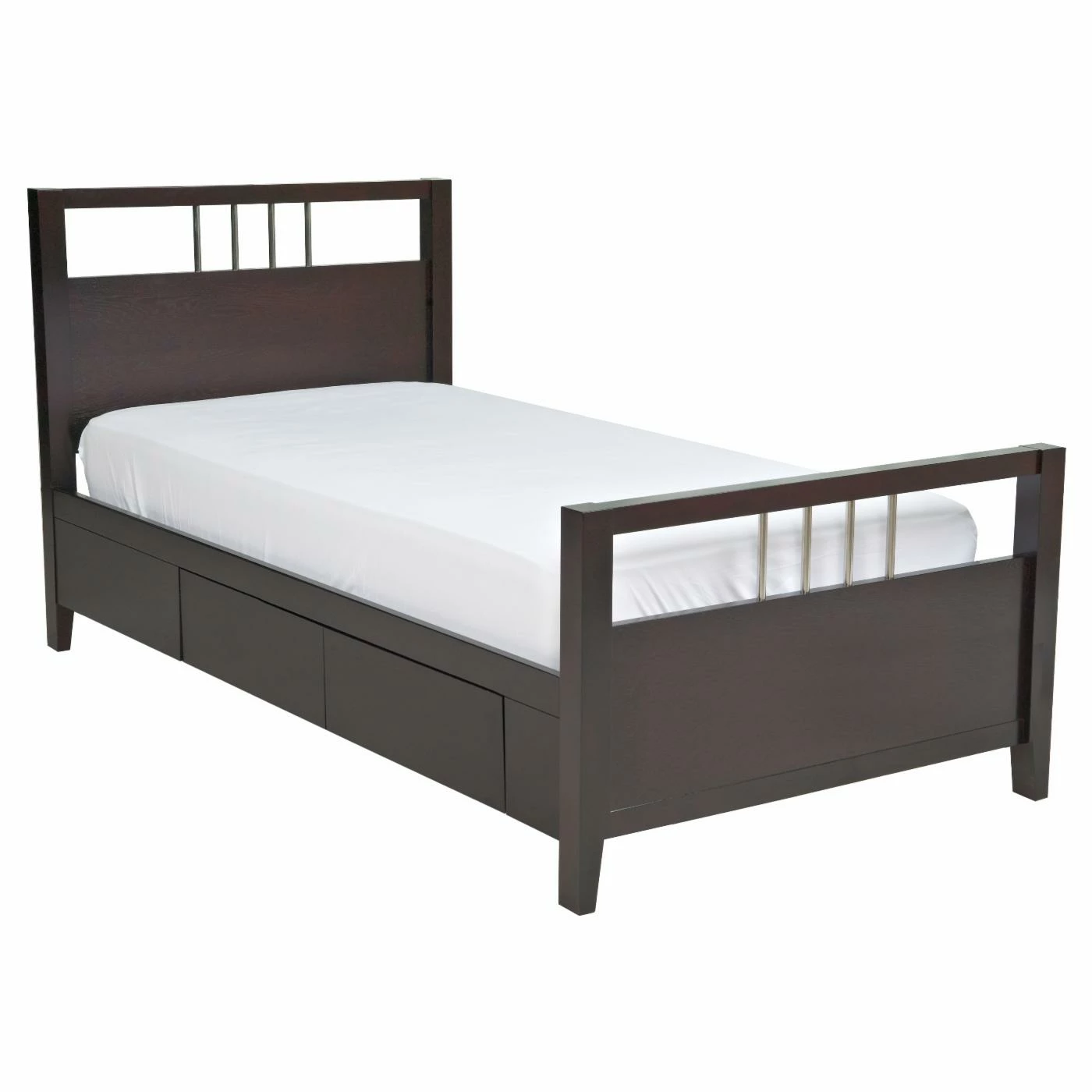 The Modus Nevis Storage Platform Bed is constructed from tropical mahogany solids and a variety of beautiful veneers coated in a lavish espresso finish. Multiple size options are available, each with flared feet and an open headboard and footboard design with four center slats. You may also add storage to your platform bed with a kit that includes a supportive slat system and four slide-out drawers great for sheets, blankets, and pillows.