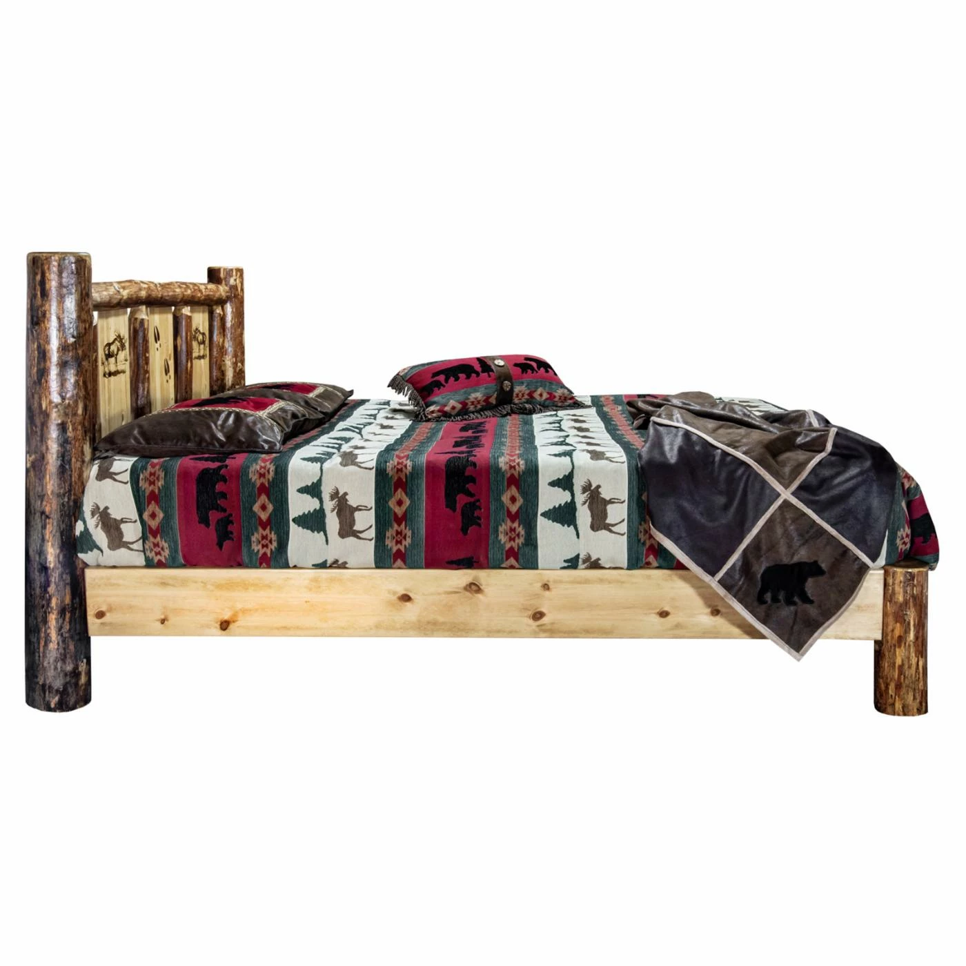 With your choice of available laser engraved images, the robust, handcrafted Montana Woodworks Glacier Country Collection Platform Bed with Laser Engraved Design will be the showpiece of your mountain lodge bedroom. This bed is built to be an heirloom that will be with your family for generations. It’s handcrafted by artisans in Montana who utilize mortise and tenon joinery and old-fashioned draw knives. The bed is crafted from solid, American-grown lodge pole pine wood with its outer bark removed, inner cambium layer left intact, and is stained and lacquered. A platform makes it mattress-ready without the need for a box spring. Choose from available size options.