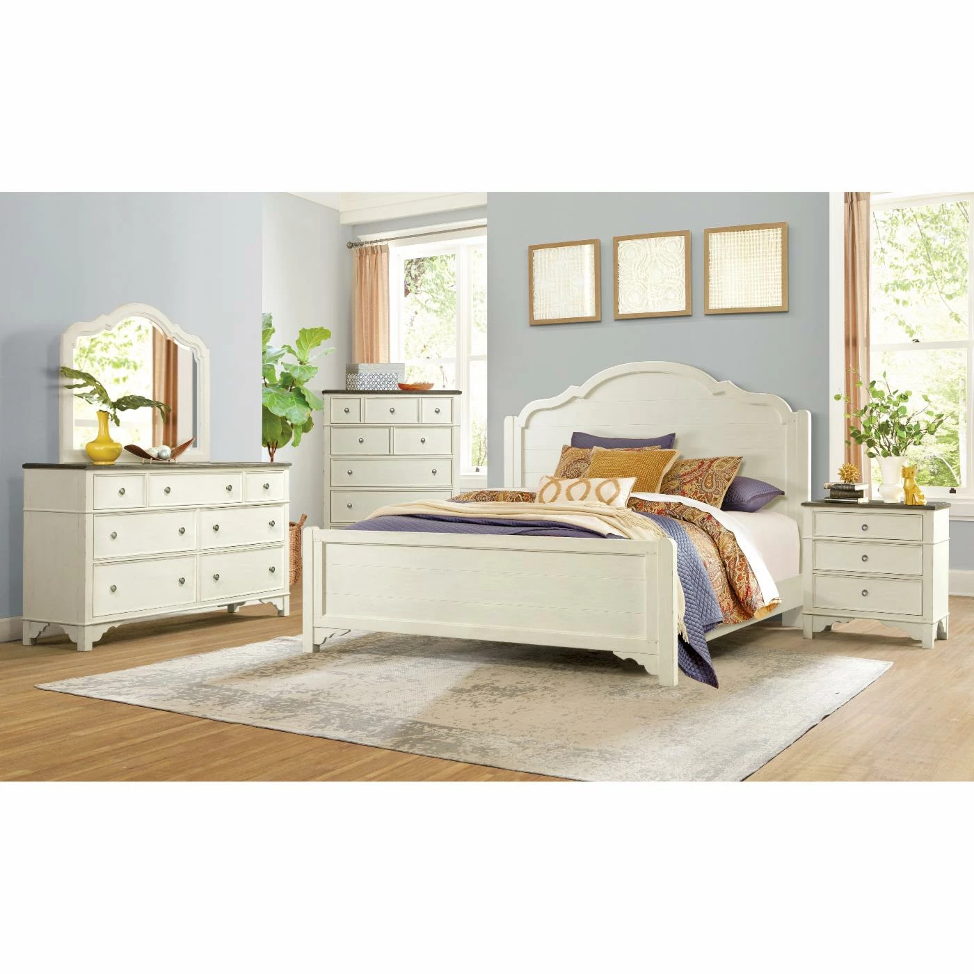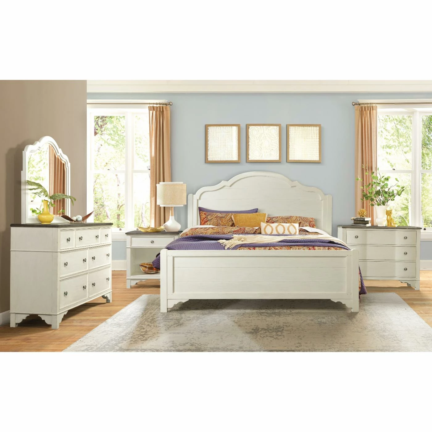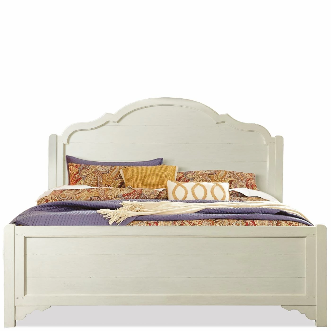 Drift off to dreamland in farmhouse coastal style with the Riverside Furniture Grand Haven Panel Bed. This panel bed comes in a distressed feathered white finish and is available in the size that best fits your bedroom. The arched design of the rubberwood and wood veneer bed has etched groves to give it a classic look. Supply a mattress and box spring (not included) to create a stylish and comfortable room.
