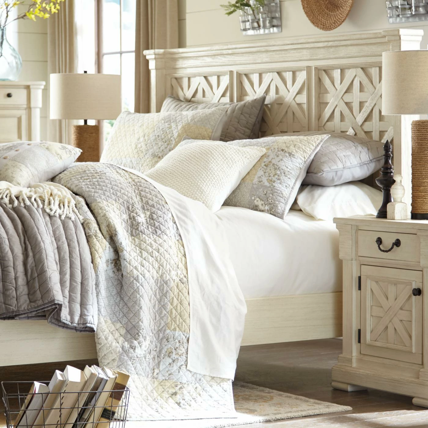 Update your bedroom with the Signature Design by Ashley Bolanburg Panel Bed. Made from acacia veneers and solids, this sturdy panel bed is finished in textured antique white for a vintage vibe that perfectly complements your cottage or country-style dΓ©cor. The louvered headboard panel showcases a lattice design to complete the look.