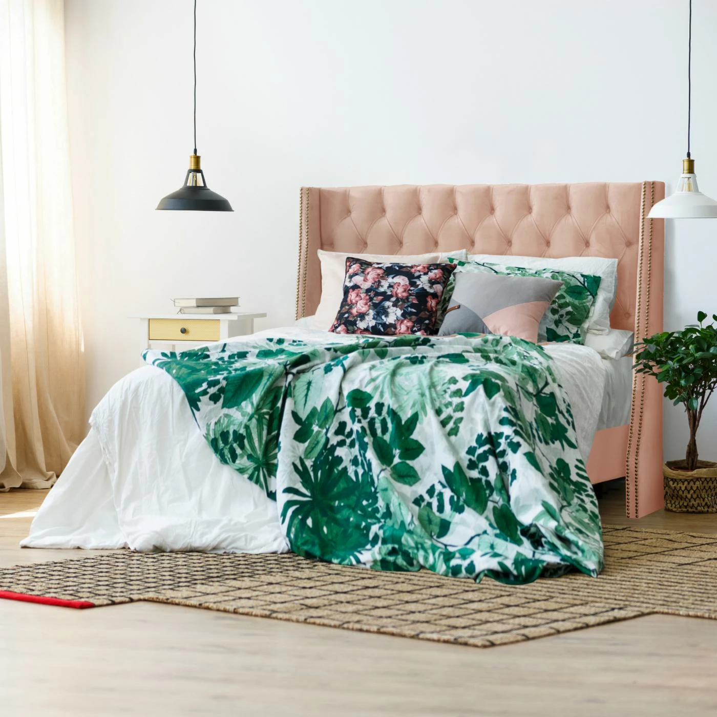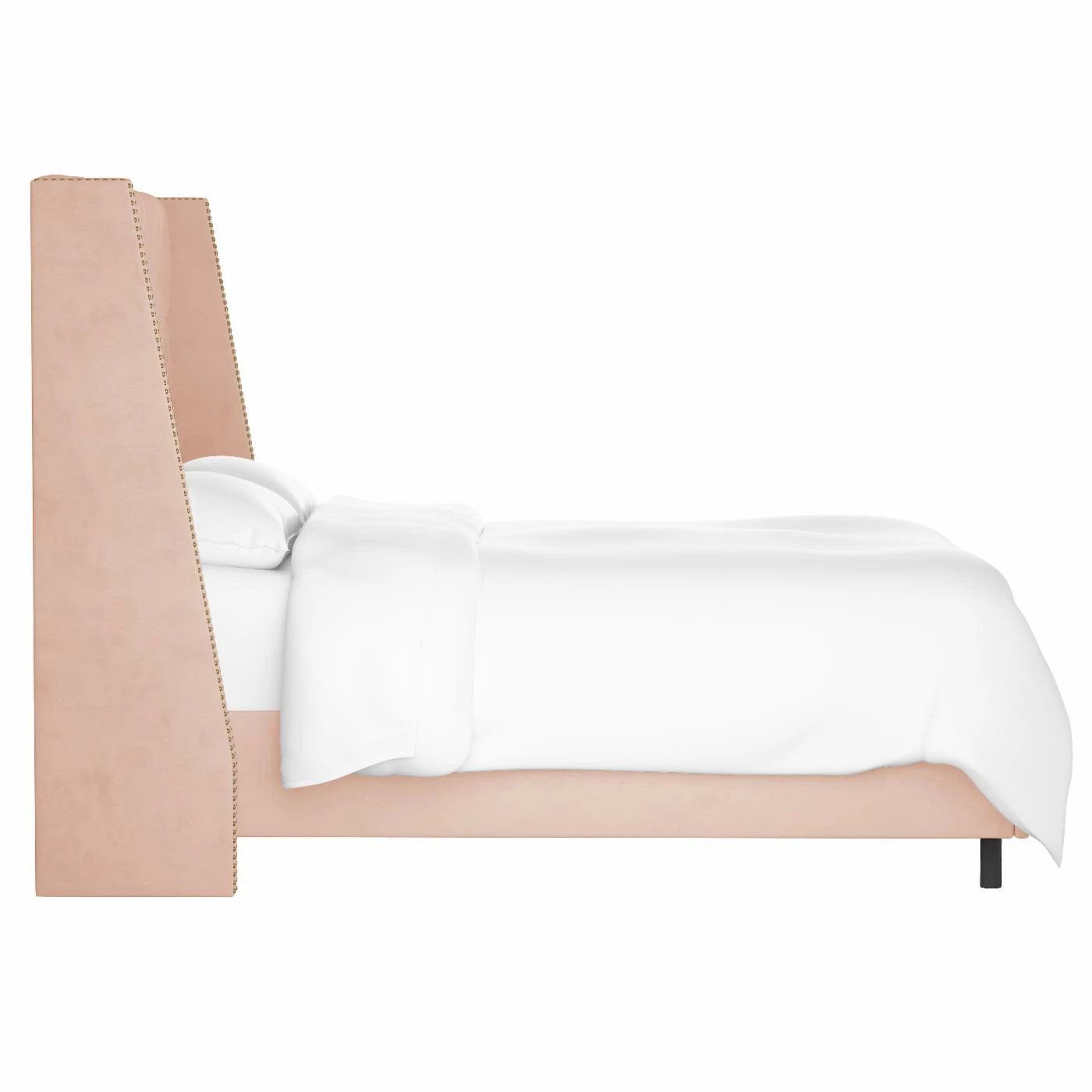 Glamorize your master or guest bedroom with the Skyline Furniture Velvet Button Tufted Nailhead Wingback Upholstered Panel Bed. Featuring a luxe wingback headboard with diamond button-tufting and hand-applied brass nailhead trim, this bed has a solid pine wood frame upholstered in 100% polyester. A standard metal bed frame is also included, but the box spring and mattress are not. Choose from available sizes and colors to find the bed that works best for your home dΓ©cor style. Assembly required.