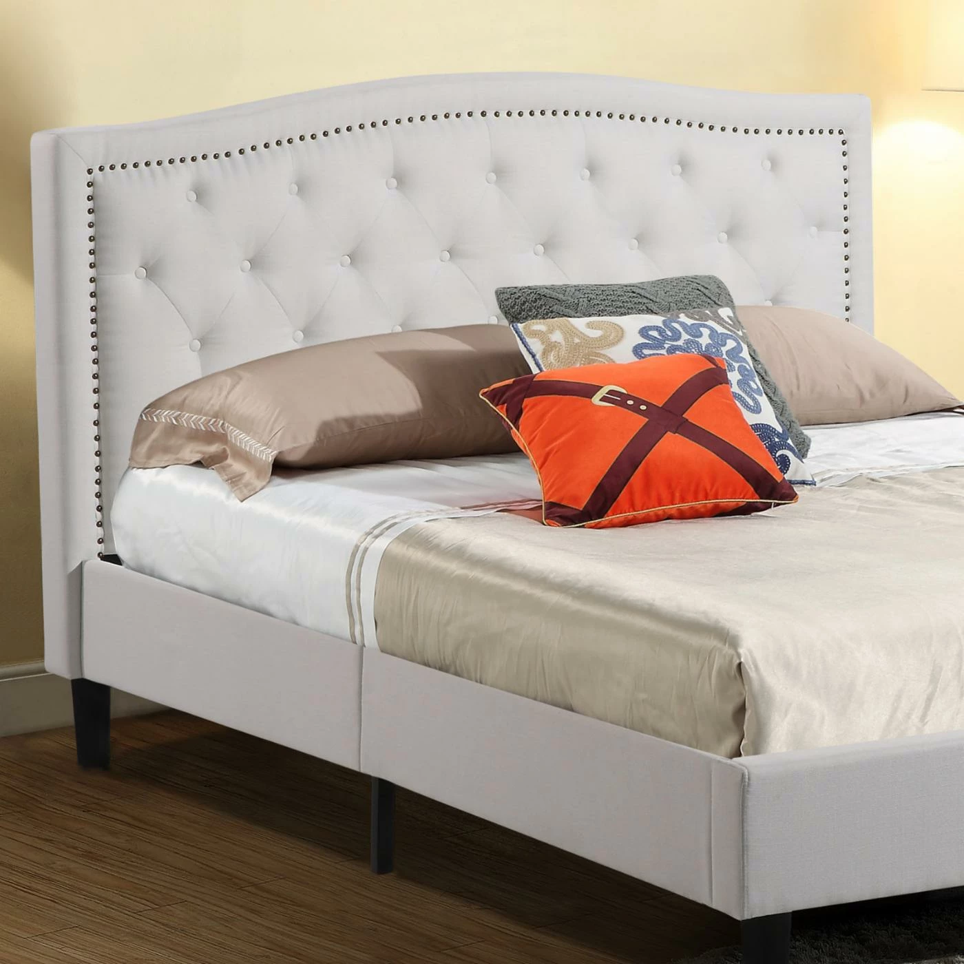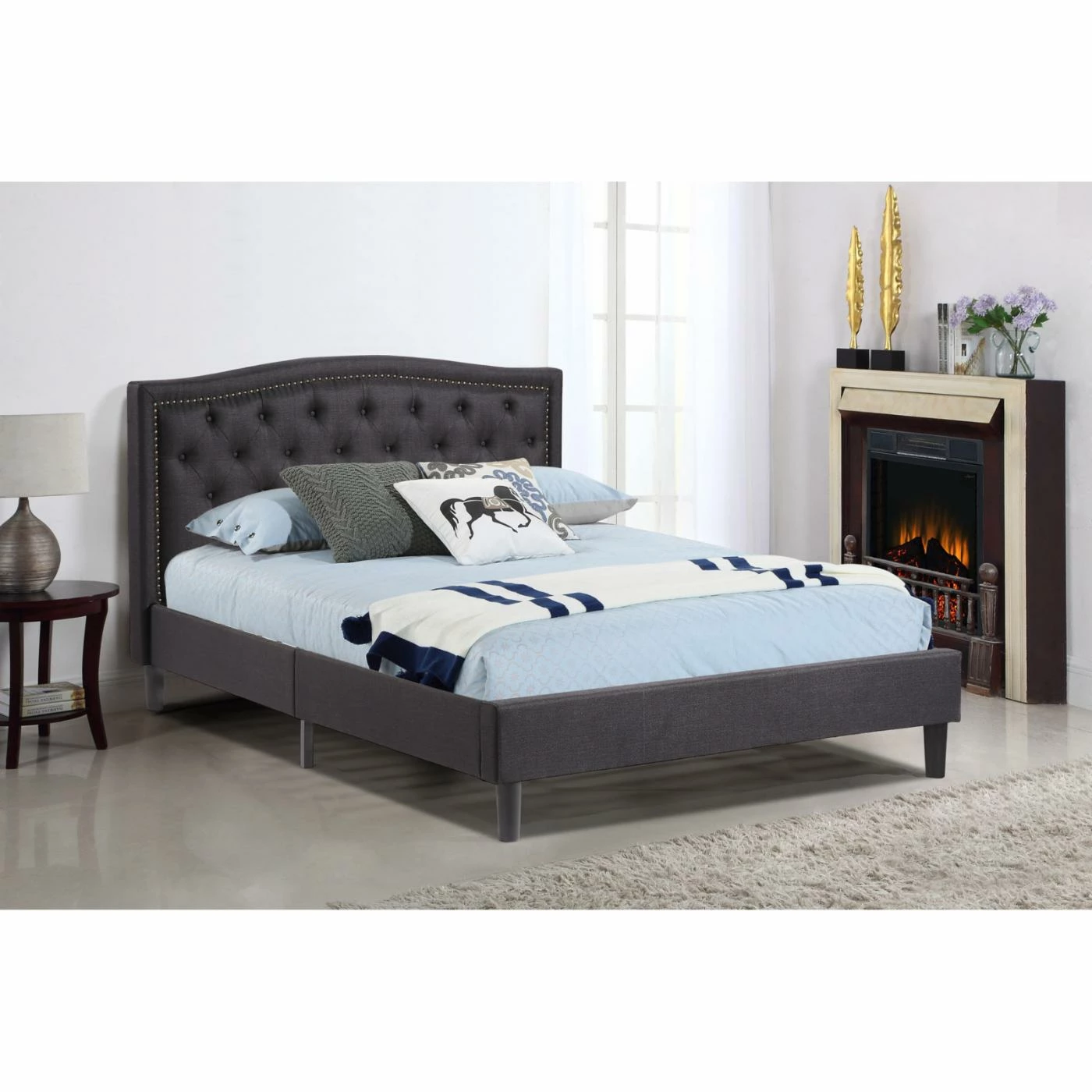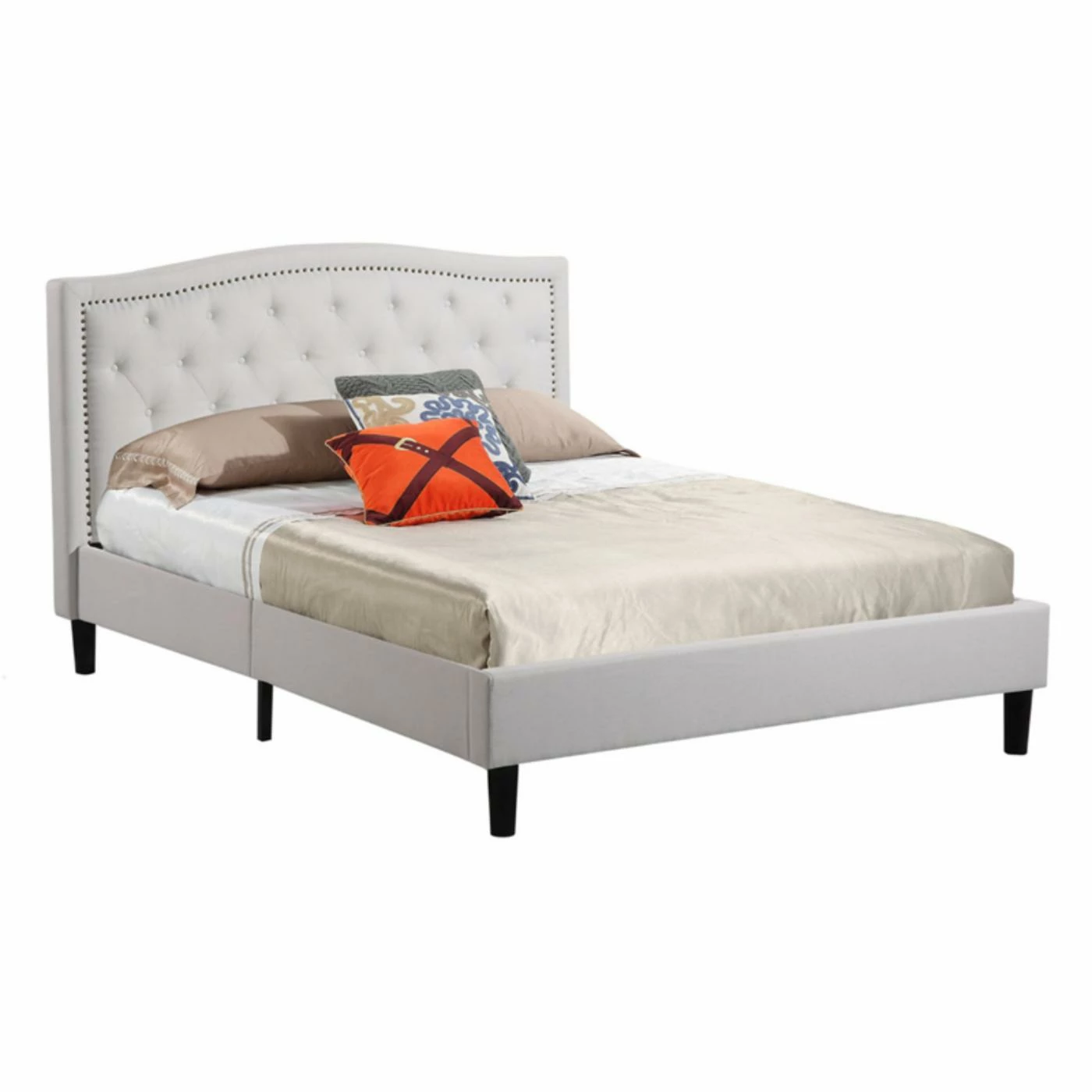 Give your bedroom a modern flair with the Abbyson Aria Tufted Platform Bed. Beautifully upholstered with high-density foam in your choice of fabric colors, this bed blends seamlessly with any décor. Button tufting and nailhead trim create a sophisticated and elegant look while the espresso finish on the legs completes the design. Made to withstand the rigors of everyday use, the frame is made from solid and manufactured wood for strength and durability. The included slat system allows you to use this bed without a box spring.