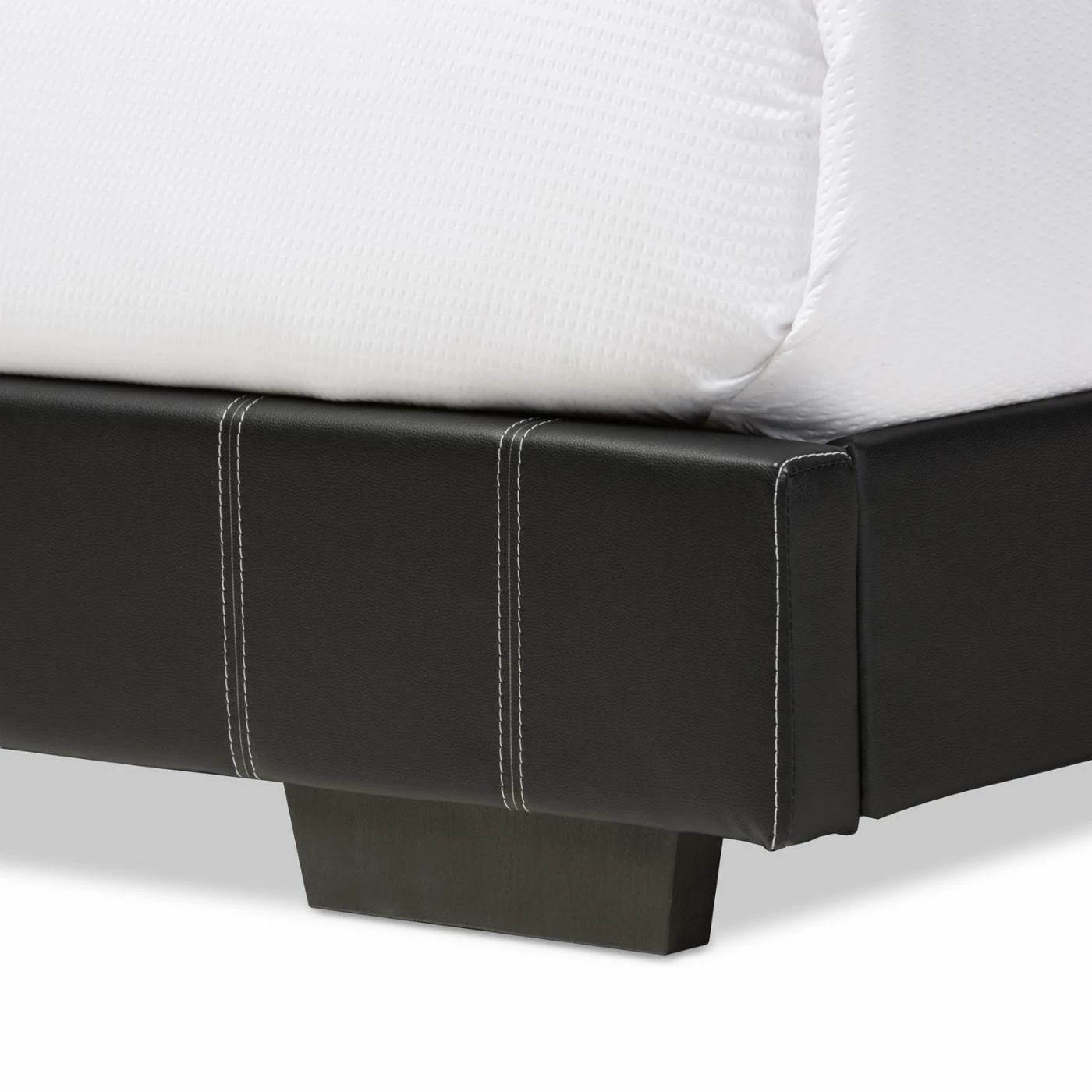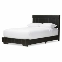 Black faux leather upholstery gives the Baxton Studio Solo Black Faux Leather Full Size Platform Bed its contemporary edge. Vertical double stitch details and chunky tapered legs add detail. This platform bed features a slat system instead of box springs or another foundation. It’s offered in full size.
