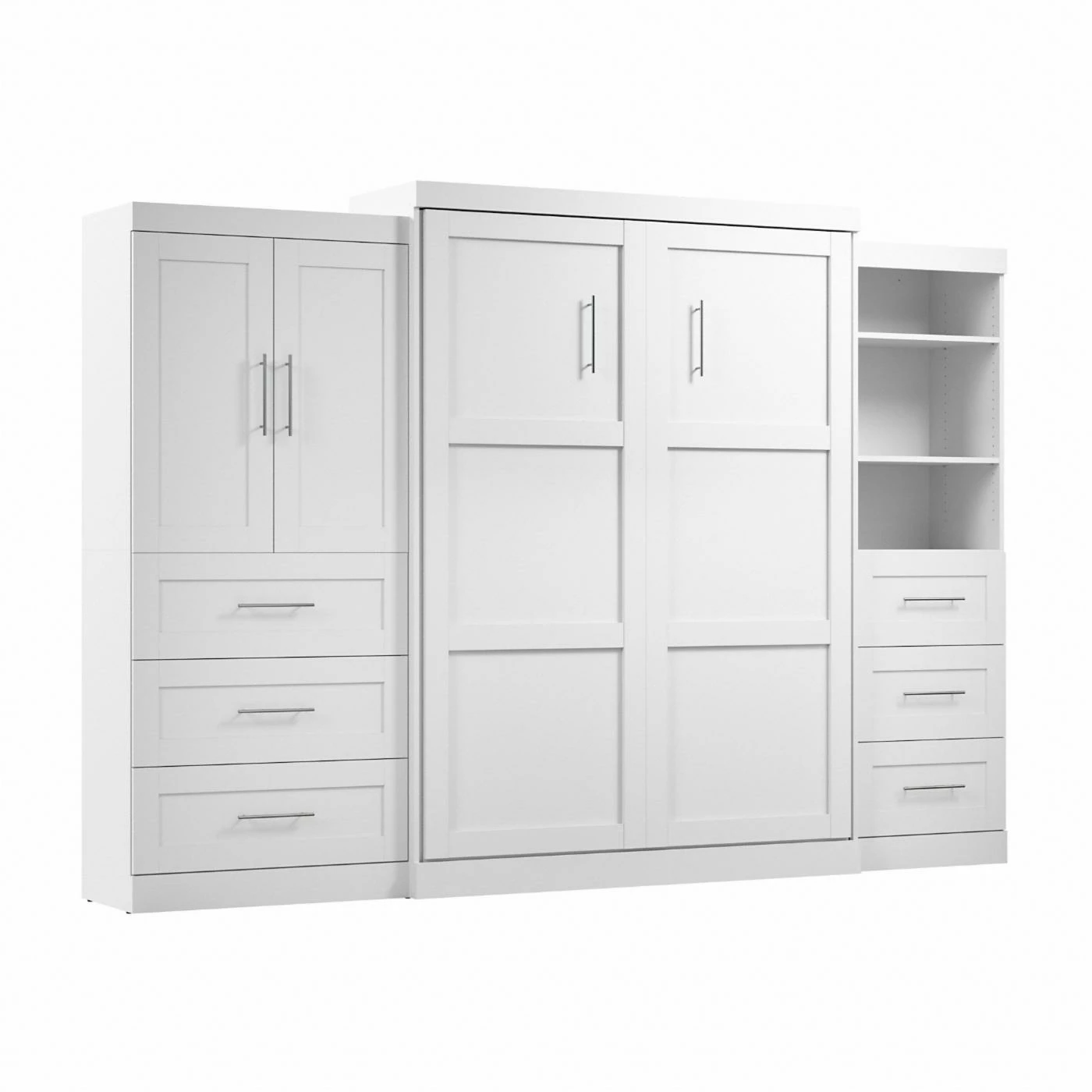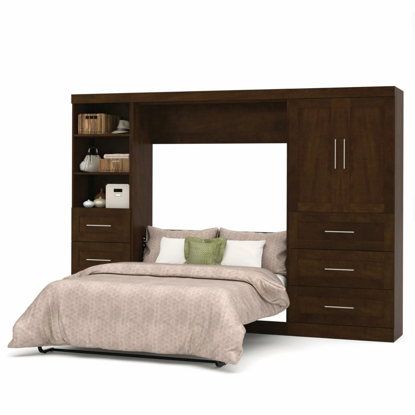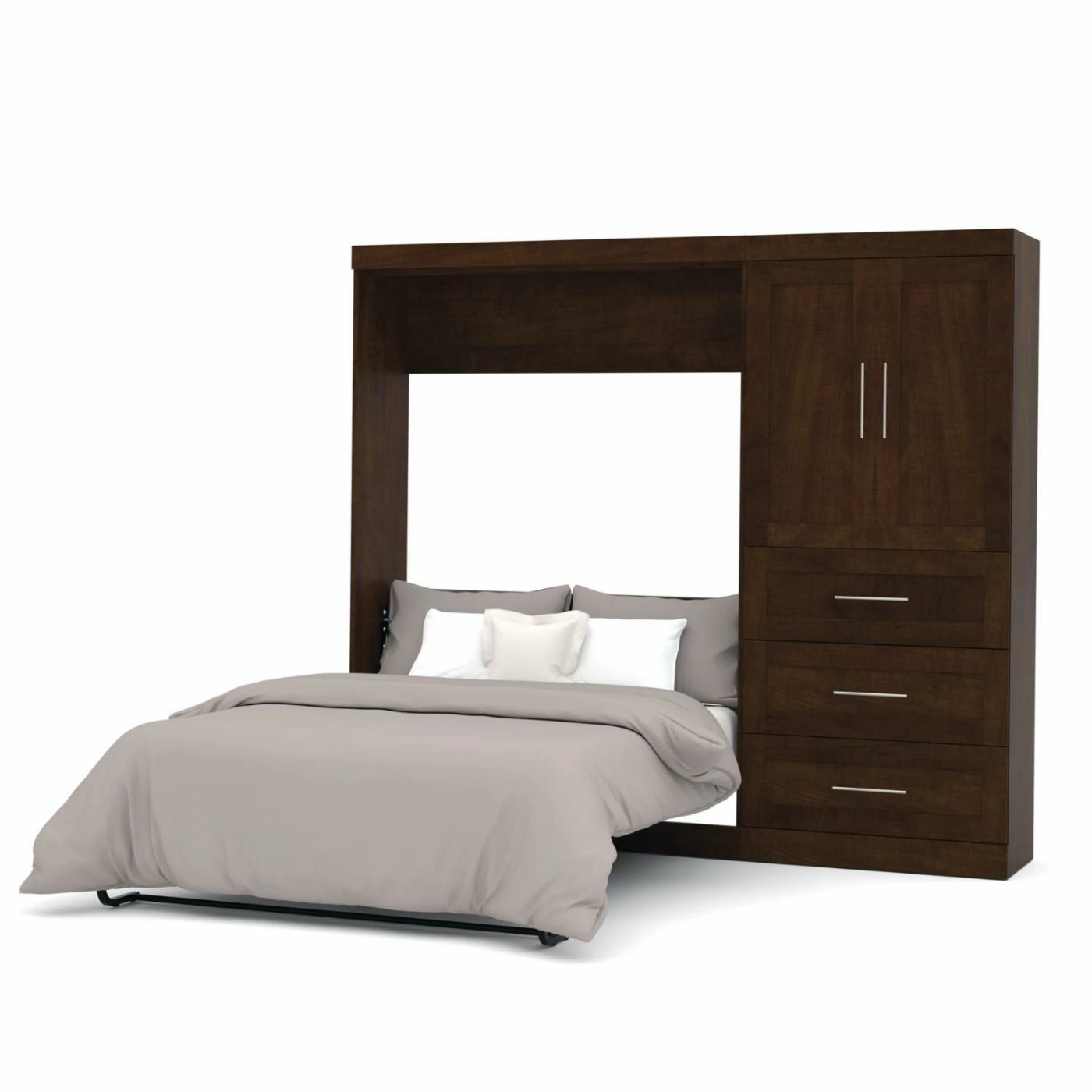 If you’ve ever been bed shopping and wanted to find something different, the Bestar Pur Murphy Wall Bed with Storage Options offers a vintage-inspired design with modern function that will expand the possibilities of your space. A classic Murphy bed frame is built into a solid wood cabinet that’s crafted with the appearance of a 2-door, Shaker-inspired armoire. A dual-piston system assists the smooth-moving hinge so that the bed comes down slowly and is easy to lift and put away. There’s a full range of finish options for the hardwood cabinet, and it’s also offered in a full range of standard sizes. This bed comes with a 36-inch storage unit that includes three drawers and a pair of paneled doors covering adjustable shelves and boasting room to accommodate two hanging rods. The three drawers slide out easily on ball-bearing glides, and if you’d like more storage, a second shelving unit can be added as well.