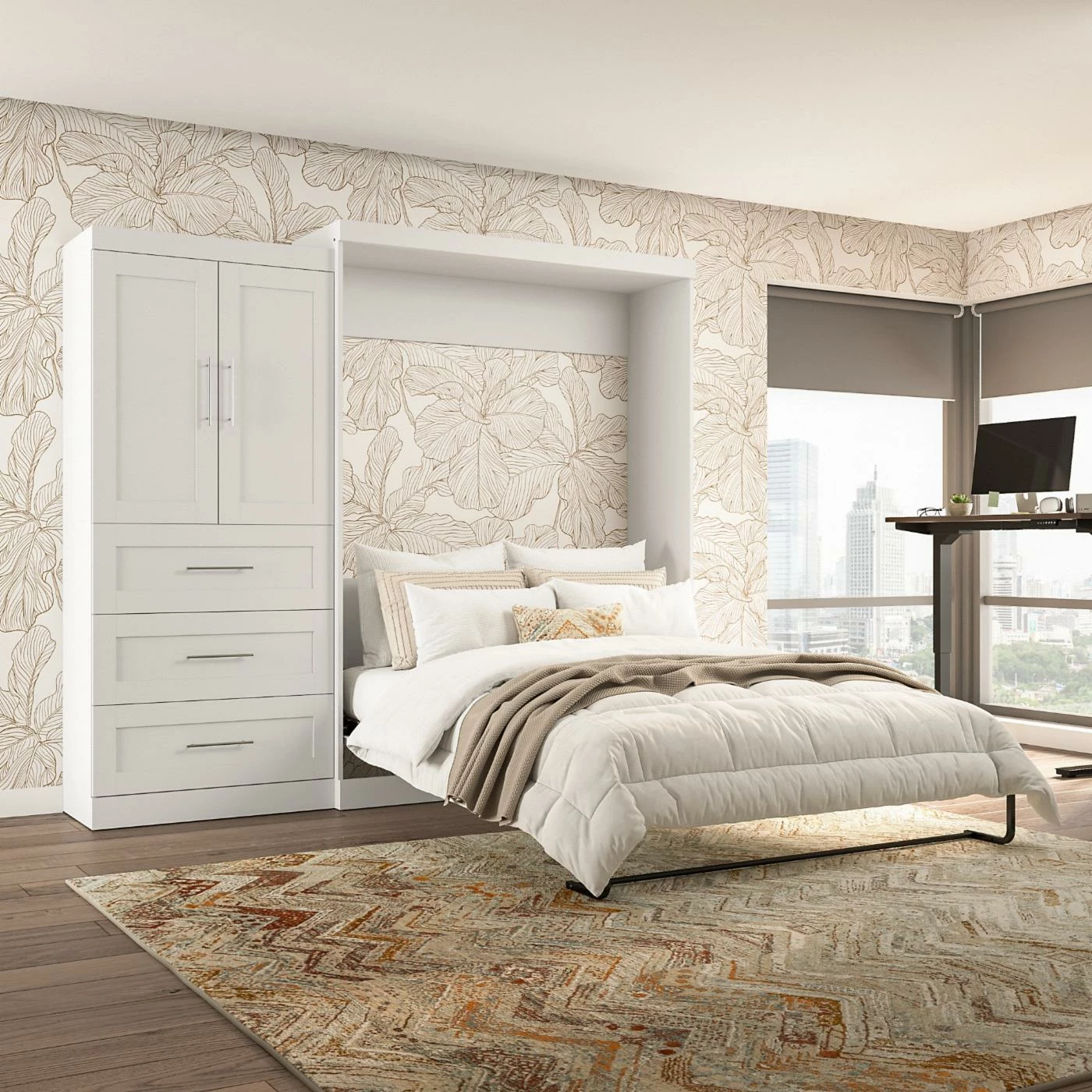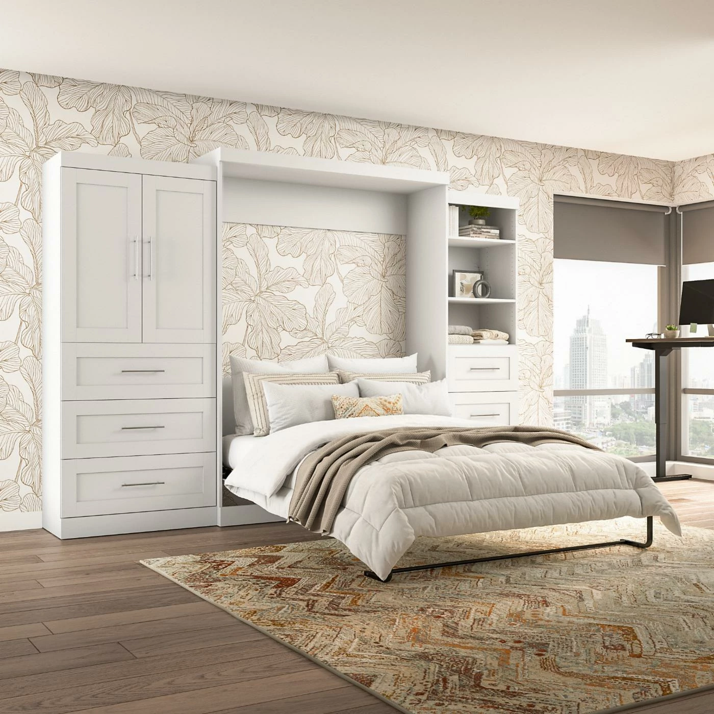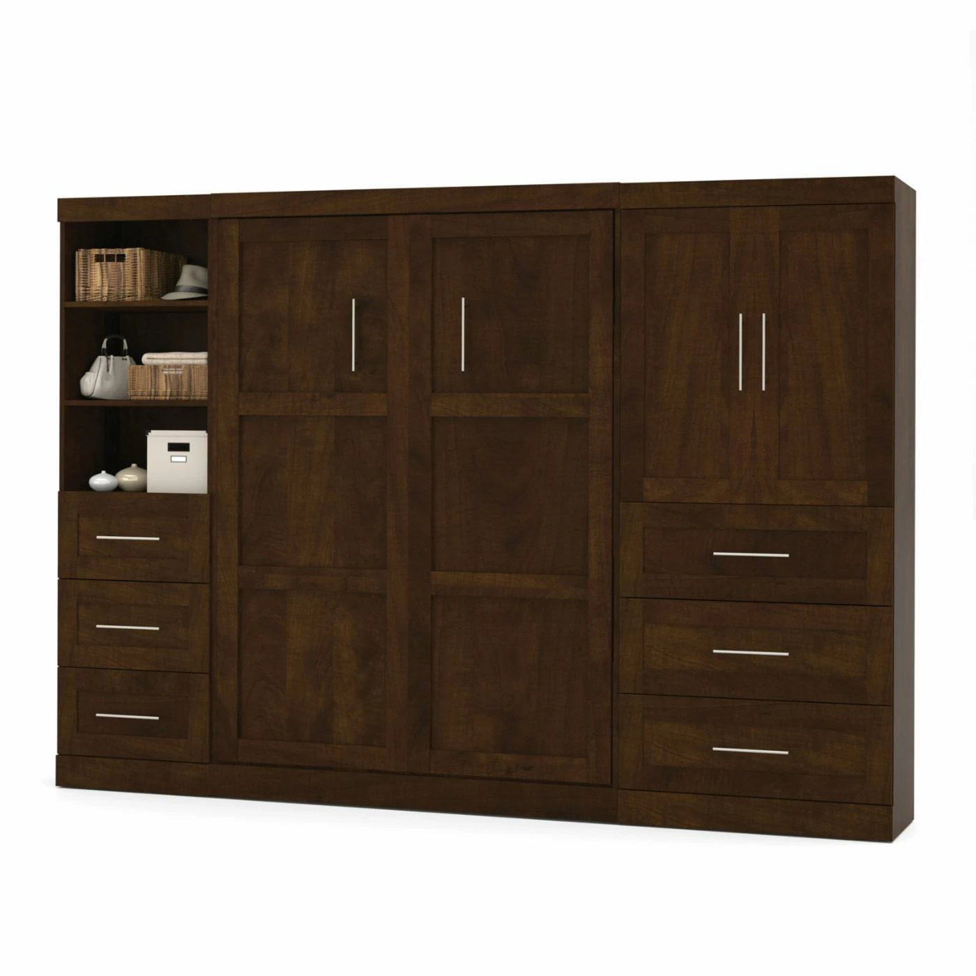 If you’ve ever been bed shopping and wanted to find something different, the Bestar Pur Murphy Wall Bed with Storage Options offers a vintage-inspired design with modern function that will expand the possibilities of your space. A classic Murphy bed frame is built into a solid wood cabinet that’s crafted with the appearance of a 2-door, Shaker-inspired armoire. A dual-piston system assists the smooth-moving hinge so that the bed comes down slowly and is easy to lift and put away. There’s a full range of finish options for the hardwood cabinet, and it’s also offered in a full range of standard sizes. This bed comes with a 36-inch storage unit that includes three drawers and a pair of paneled doors covering adjustable shelves and boasting room to accommodate two hanging rods. The three drawers slide out easily on ball-bearing glides, and if you’d like more storage, a second shelving unit can be added as well.