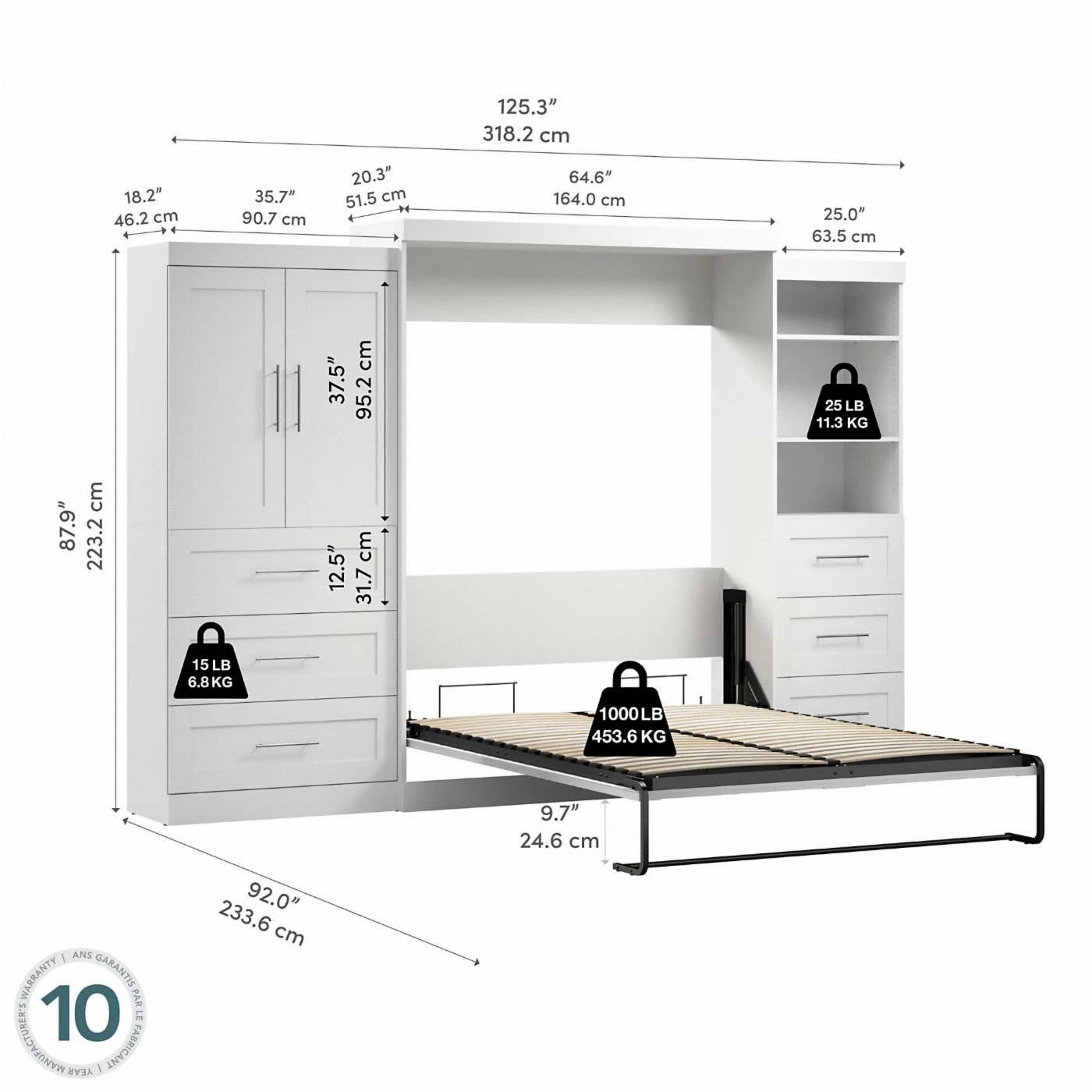 - Queen with 36-in. and 25-in. unit: 125.3W x 20.3D x 89.1H in.