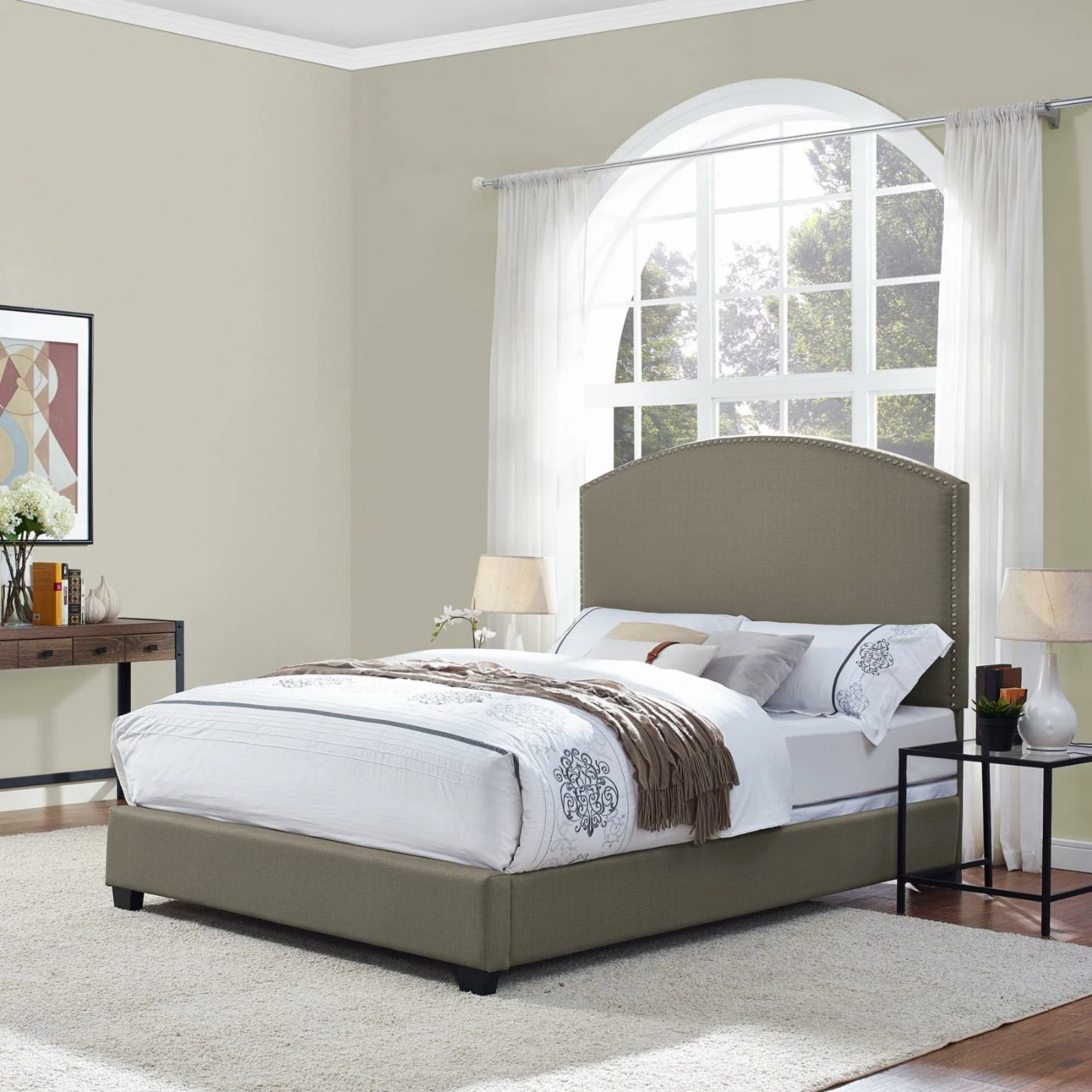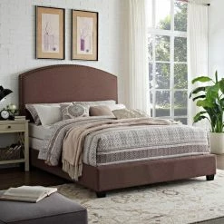 Simple and sophisticated, the Crosley Cassie Curved Upholstered Low Profile Bed features refined linen upholstery and nailhead trim along the headboard. The sturdy engineered and solid wood frame provides long-lasting support. The low profile design allows you to lay your mattress right on the bed frame without a box spring.
