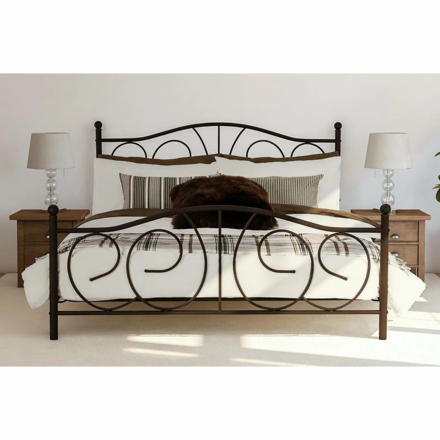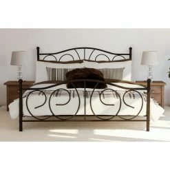 With swooping lines and elegant styling, the modern DHP Victoria Metal Bed is a frame fit for a queen. Finished in a dark bronze-colored metal, this frame works perfectly in either minimalist or modern designed rooms, or even with more romantic, ornate dΓ©cor. A foundation is not required with the frame, and a mattress is not included. Available in select sizes.