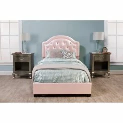 Customize your new bedroom with the Hillsdale Furniture Karley Bed Set. This set allows you to choose your bed components from the available options from just a headboard to a complete frame. The platform design is crafted from thick wood and needs no box-spring. The headboard has a wide, arched look with a padded, tufted center. Thick foam padded encases the entire frame. Choose your size, configuration, and upholstery from the available options.