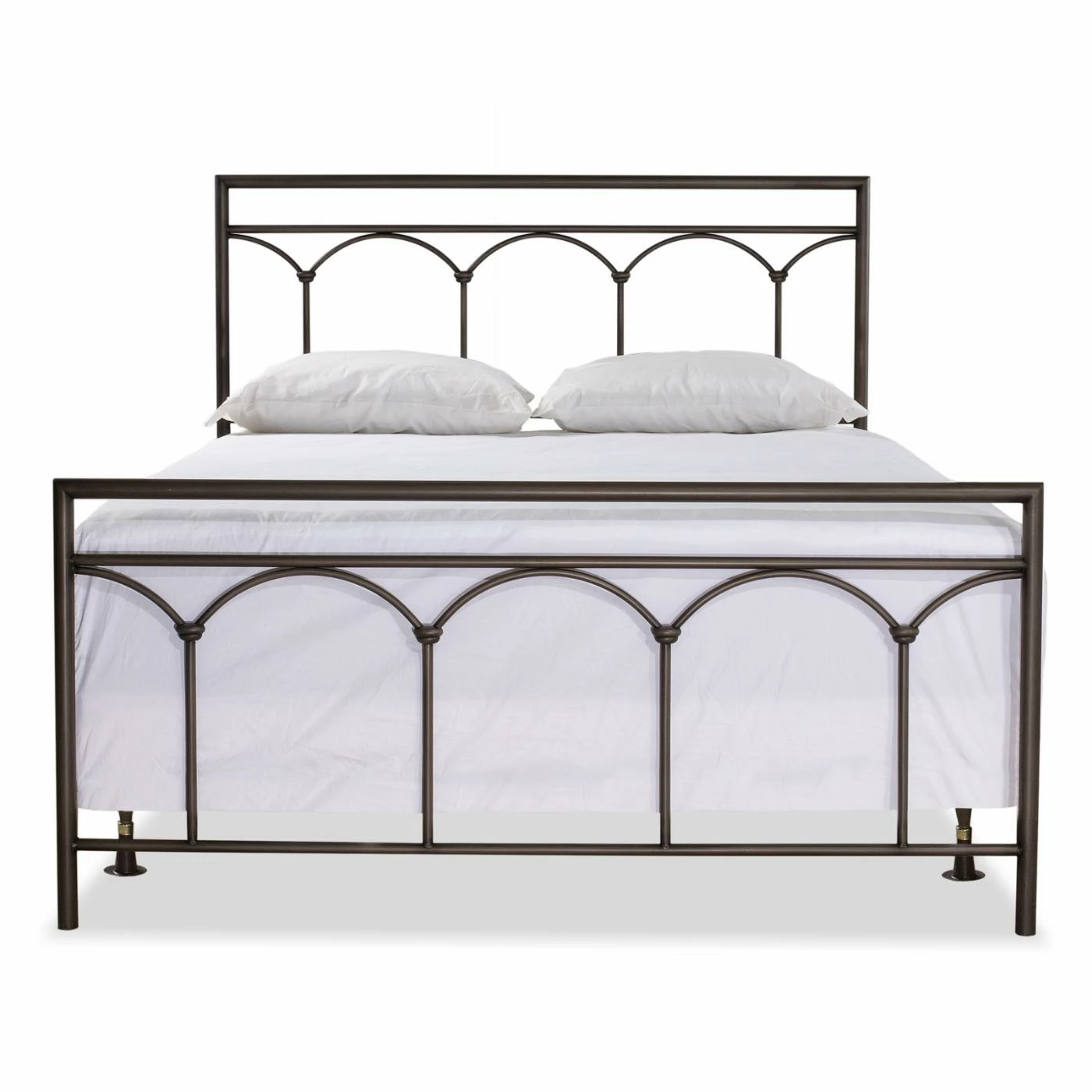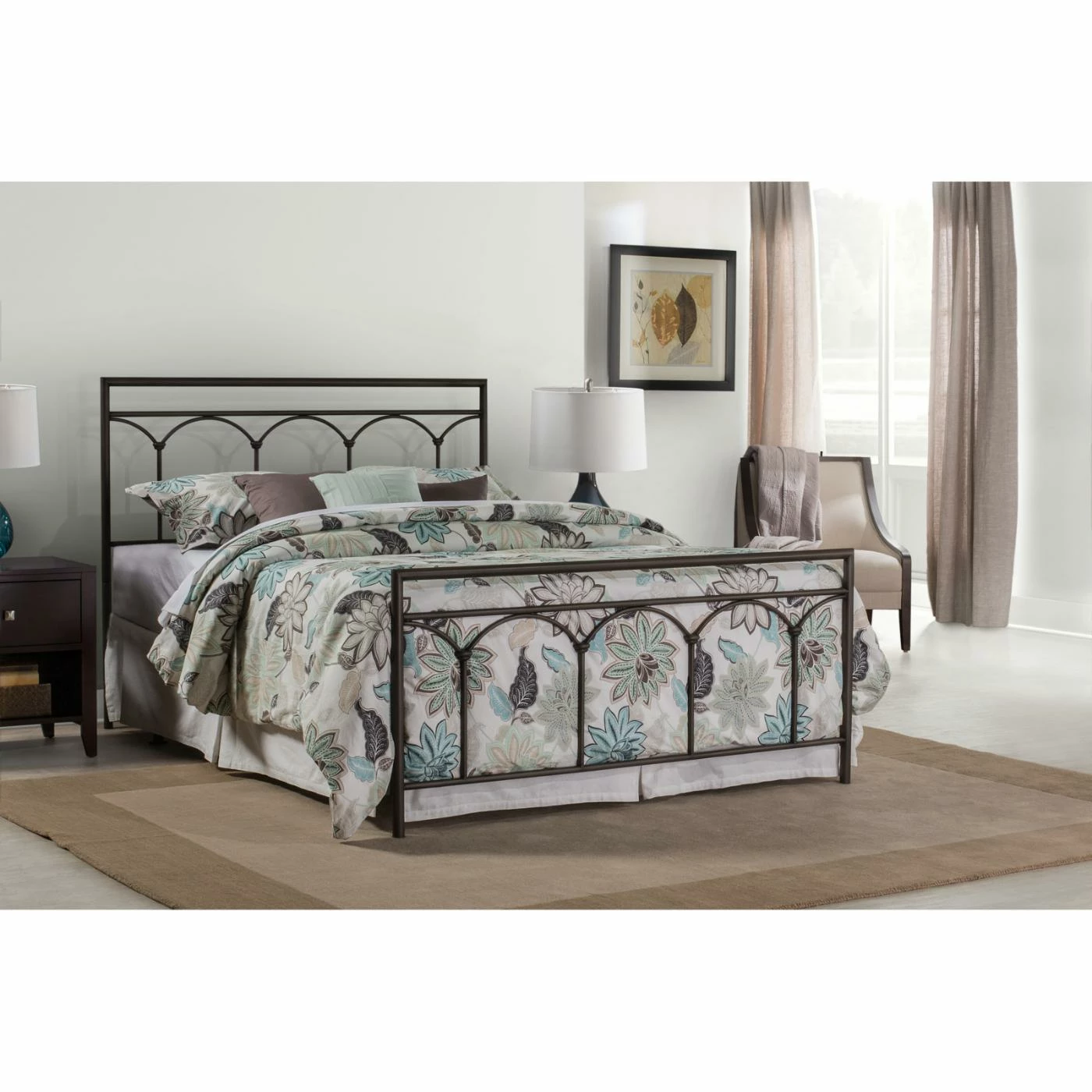 The Hillsdale Furniture Milwaukee Bed Set showcases a transitional style with sleek black metalwork. It boasts traditional posts with teardrop wire designs on both the headboard and footboard. The flowing scroll details offer ornate appeal. Choose from available size options.