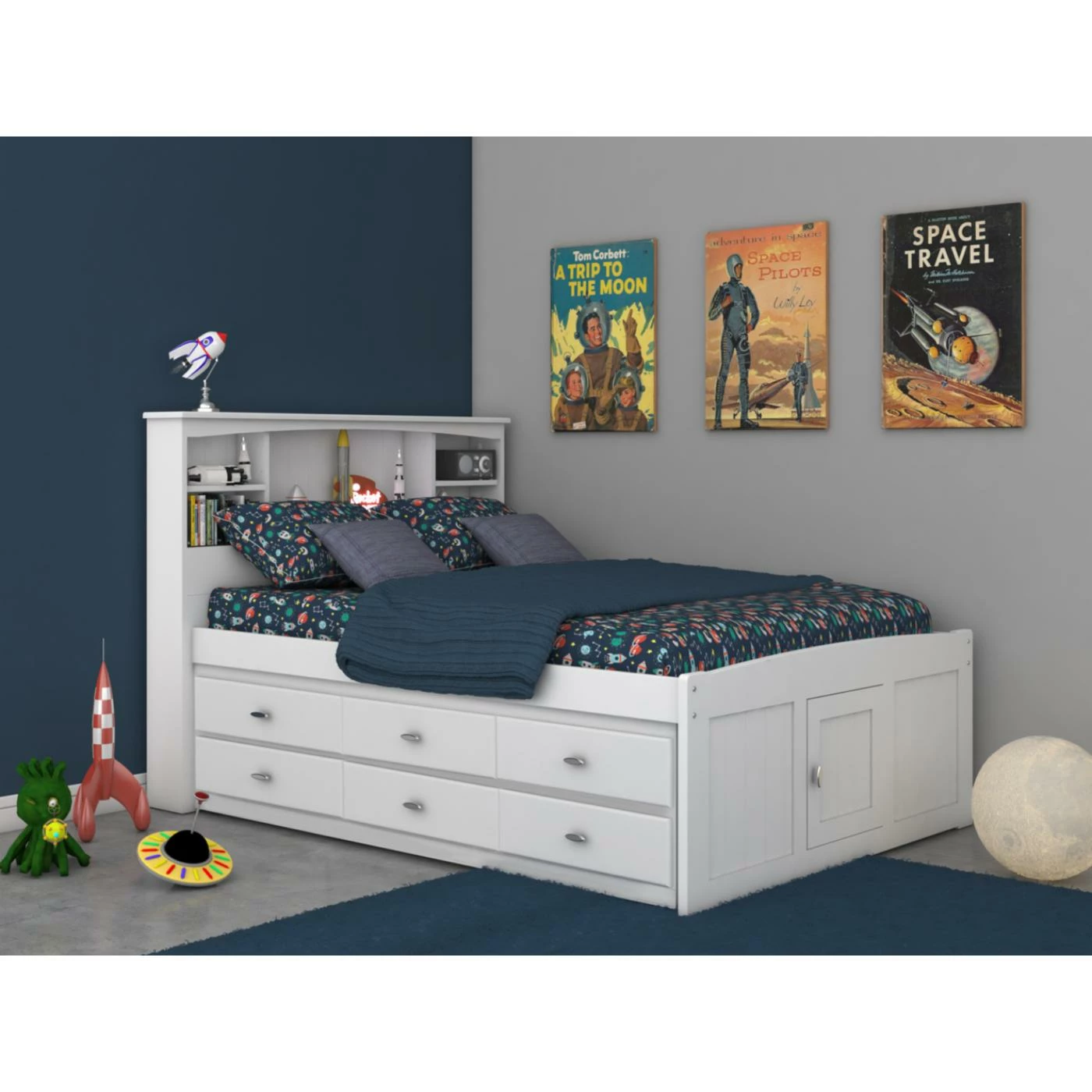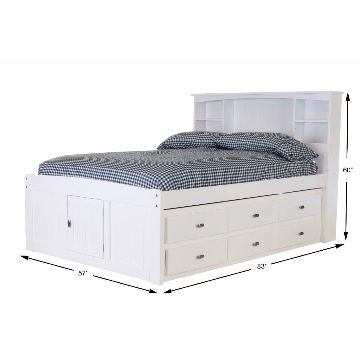 Add fashion and function to your child’s bedroom with this full size captains bookcase bed in a casual white finish. The ready-to-assemble unit provides loads of storage with six sturdy drawers that can be placed on either side of the bed and underbed storage accessible from either end of the bed. The drawers feature metal drawer guides and attractive pulls. Quality and solid wood construction makes this captains bed a great purchase.