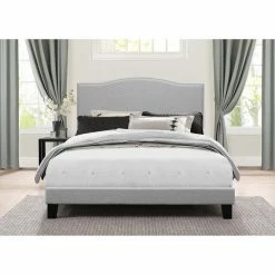 Add panache to your bedroom with this Hillsdale Kiley Upholstered Low Profile Bed. Its gently arched headboard is trimmed in sassy silver-finished nail heads. The headboard and low profile footboard plus rails are upholstered in your choice of available fabric color. The bed comes in your choice of available size options.