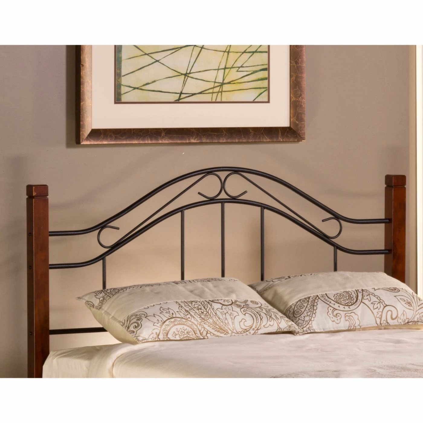 The charming, refined look of the Matson Wood and Metal Bed – Cherry/Black turns your bedroom into one of storybook perfection. Lovely curved metal flourishes create a dreamy landscape, perfect for peaceful slumber. Fully-welded metal in a chic black finish contrasts beautifully with the rich look of cherry finish solid wood corner posts. Simple, traditional design has never been more elegant. Assembly required.