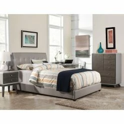 Luxurious gray faux leather upholstery ensures this Hillsdale Lusso Faux Leather Panel Bed will be the centerpiece of your sophisticated bedroom retreat. The bed has a slightly curved, button tufted headboard. Its low profile footboard and rails are upholstered for a contemporary look. This bed is available in size options.
