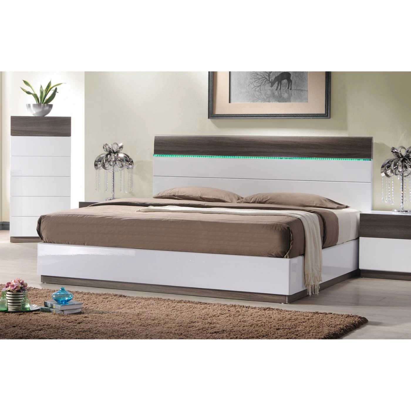 Illuminate your bedroom in modern style with the J&M Furniture Sanremo Platform Bed. This 2-toned platform bed boasts sleek horizontal style lines for a linear effect. A contemporary LED light incorporated into the headboard can easily be turned on and off with the flip of a switch. The rich wood veneer is complemented with a high-gloss white lacquer finish. This platform bed is the ideal complement to the rest of the items available within the Sanremo collection. Choose from the available size options when placing your order.