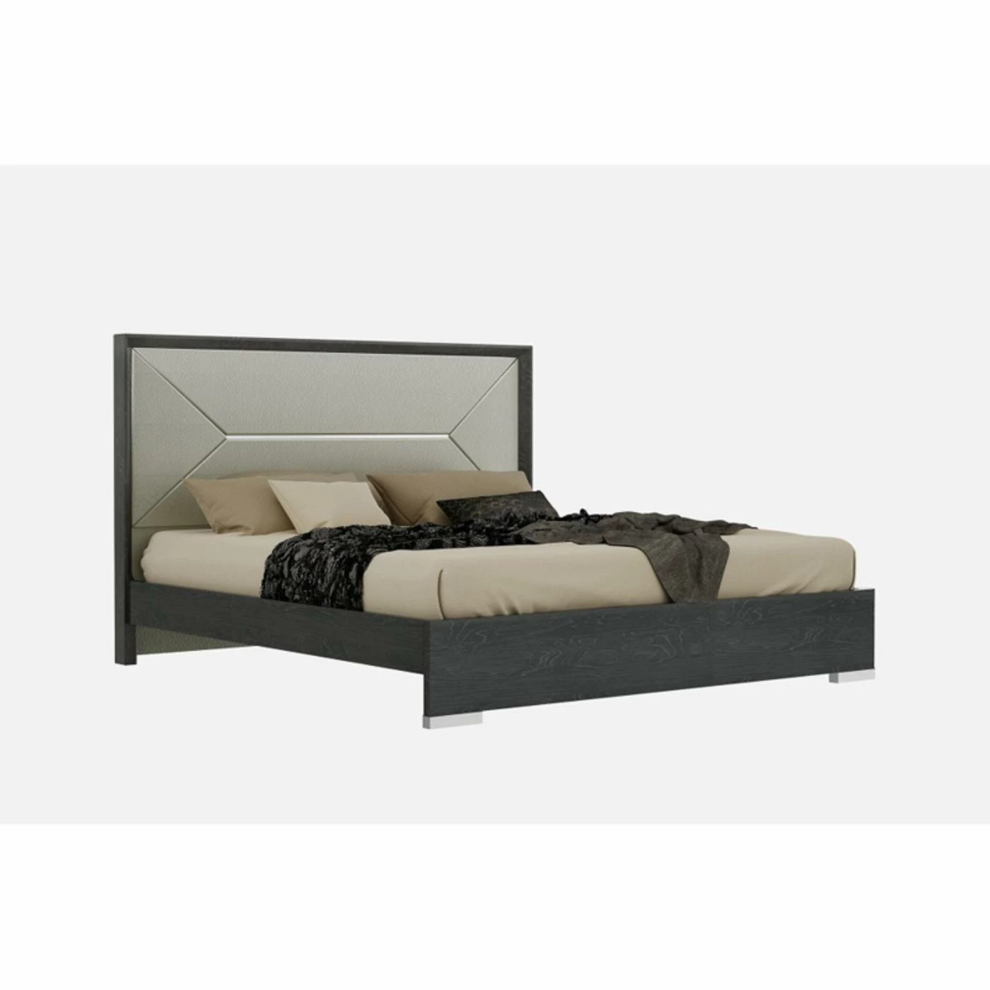 The J&M Furniture Monte Leone Platform Bed is designed to be the showpiece of your bedroom suite. Its dramatic headboard includes matched geometric panels of textured gray fabric and a gleaming strip of chrome. The frame is finished in a high-gloss deep gray three-layer lacquer that allows the wood grain to shine through. This platform bed is offered in a choice of available sizes.