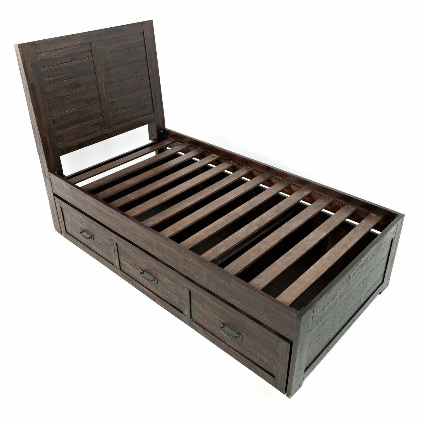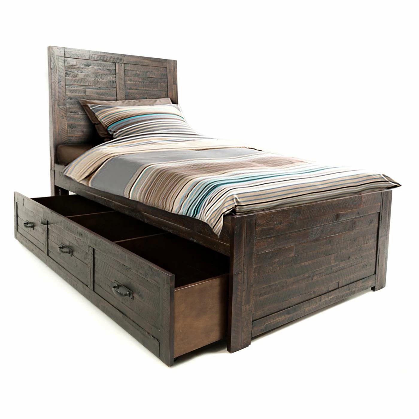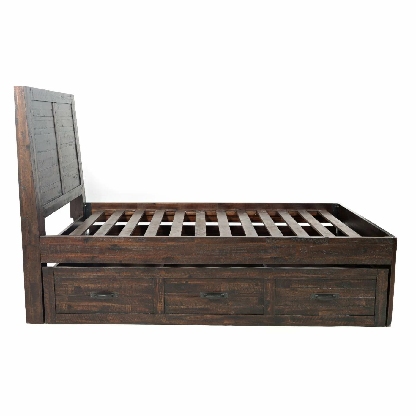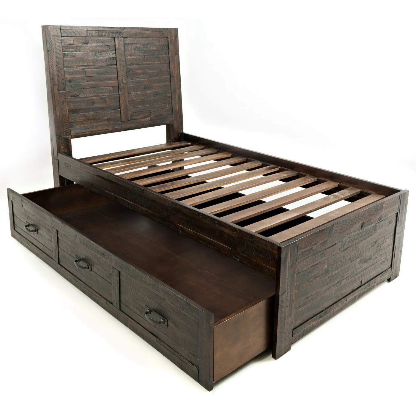 The Jofran Jackson Lodge Twin Bed with Trundle offers rustic style and convenience. Wooden slats support a standard twin mattress, while the rolling trundle can be used as underbed storage or with a mattress (not included) for an extra bed. The solid wood construction boasts a rich dark brown distressed finish and dark metal hardware.