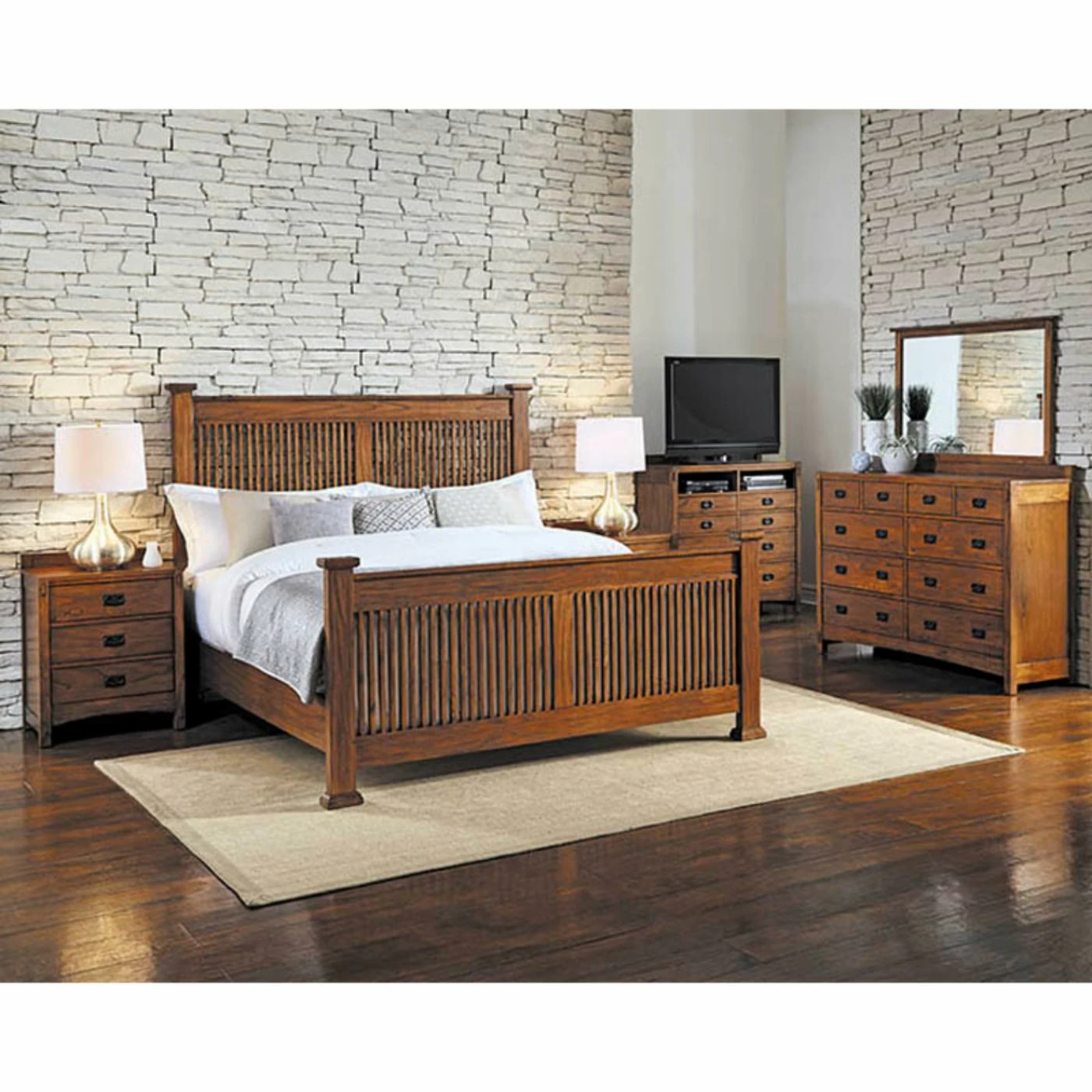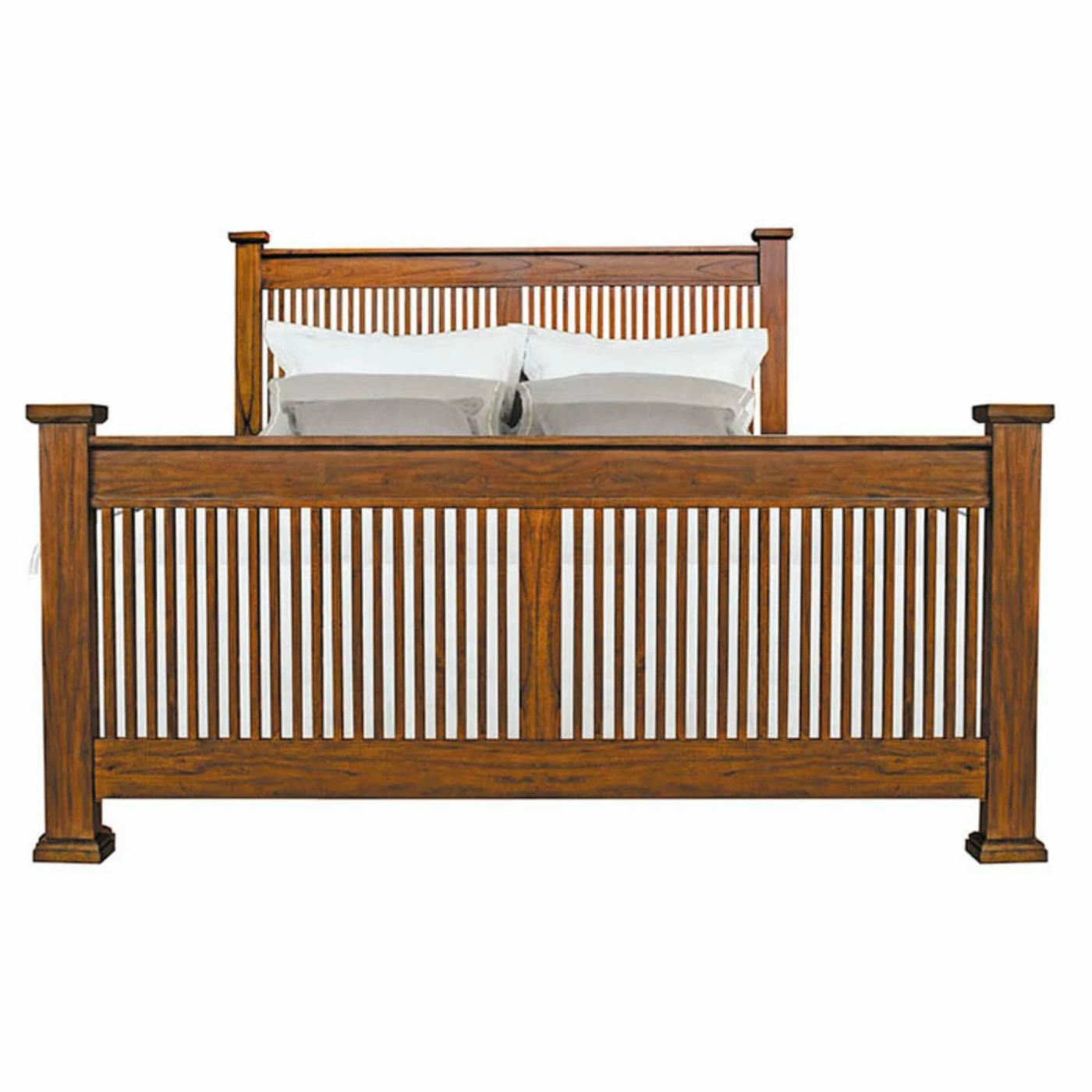 If you’re a devotee of classic Craftsman style and a fan of quality furniture, you’ll rest in satisfied slumber on the A-America Mission Hills Slat Bed. Vertical slats adorn the headboard and footboard in a striking statement of Mission sensibilities. Chamfer detailing can be found on the posts on either side of the headboard and footboard, which are constructed from solid mindi wood, as is the rest of this stunning bed. The hardwood goes through a kiln-drying process to prevent cracking, warping, or splitting, ensuring that you’ll be sleeping comfortably in this bed for many nights throughout the years. All of the beautiful details of this panel bed are highlighted by the lustrous glow of the harvest finish, achieved through a 10-step process that showcases the elegance of the natural wood. This classically designed bed would look perfect in an ensemble with other Mission-style pieces, or on its own as a centerpiece in a more contemporary setting.