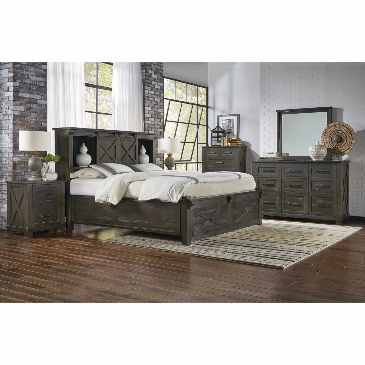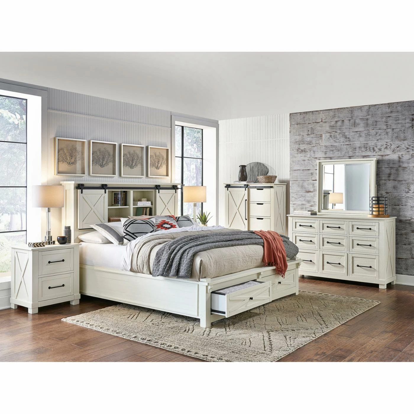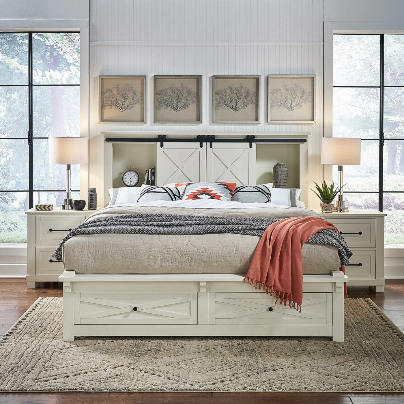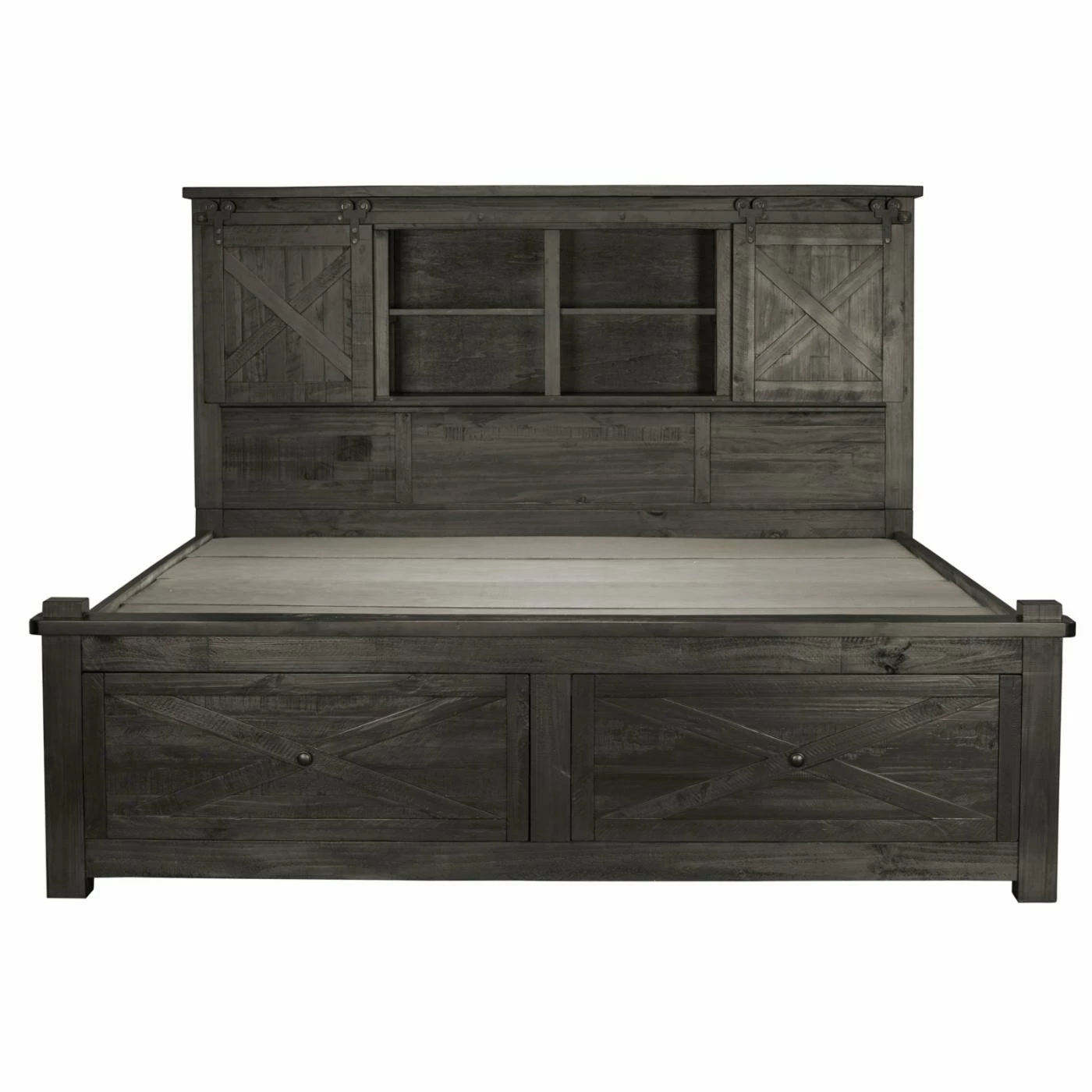 What we love about this bed is the built-in storage – including shelves in the headboard and two full drawers at the foot. A stylish feature is the barn-door-style doors on ball bearings that slide to cover the shelves. You can even use the extended footboard area as a bench. This bed is a multi-tasker that would look so great in a farmhouse, industrial, or rustic space. Really it’ll blend beautifully with any decor.