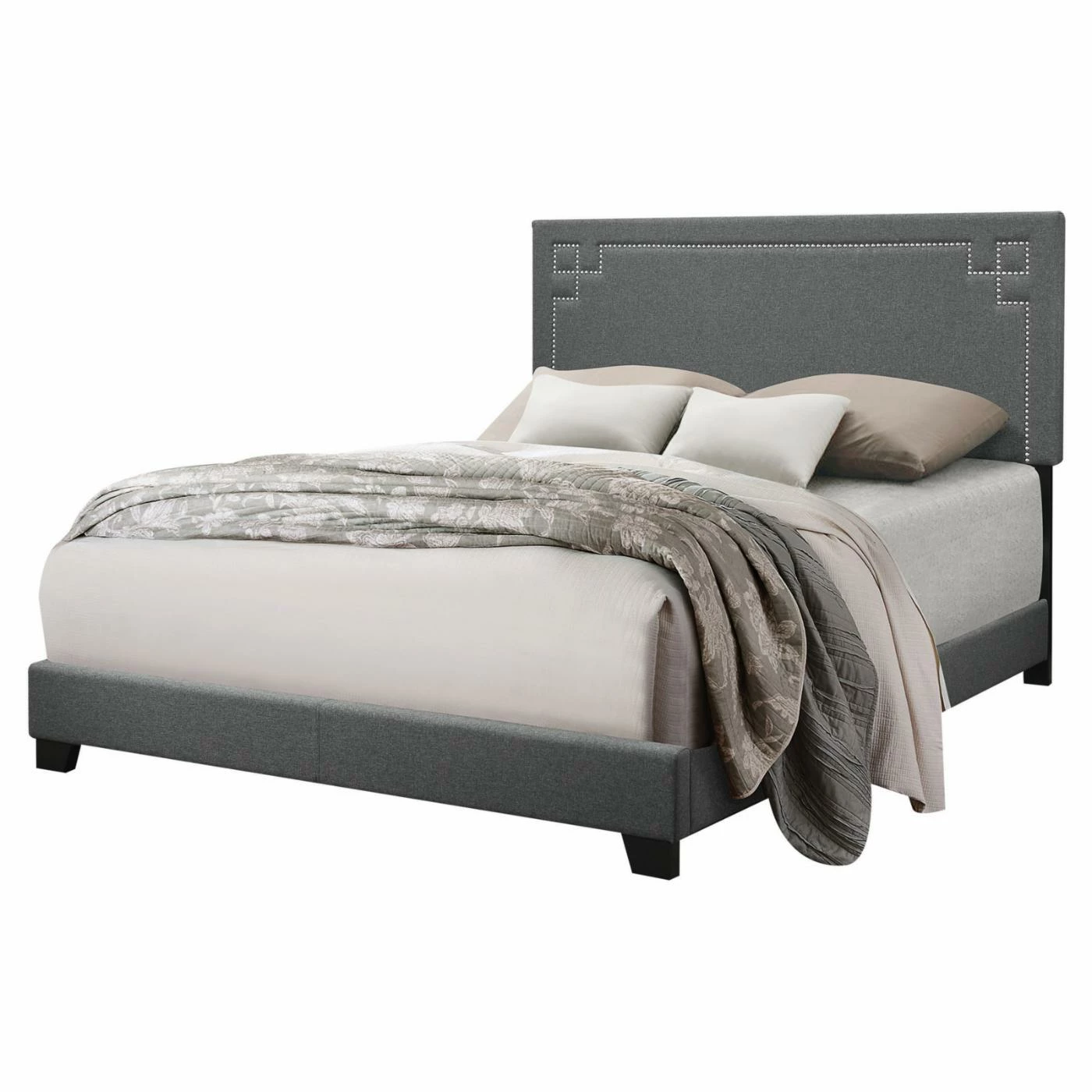 Simple yet sophisticated, the Acme Furniture Ishiko II Bed will elevate your contemporary bedroom dΓ©cor. The panel headboard is comfortably cushioned with foam and wrapped with dark gray fabric. Chromed nailheads create a geometric motif for added interest. To complement the headboard, the rails and low-profile footboard of the solid wood and engineered wood bed feature matching upholstery.