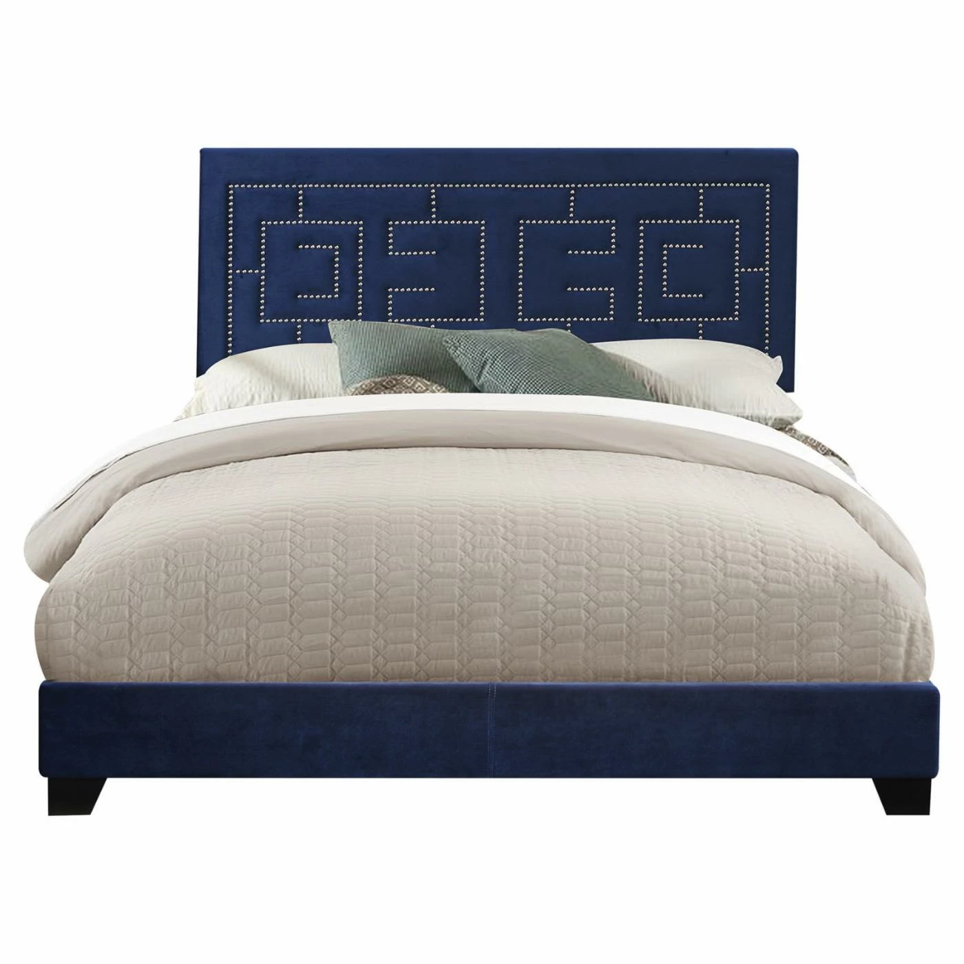 Brighten up your contemporary bedroom with the Acme Furniture Ishiko III Bed. Plush velvet upholstery brings a vibrant royal blue to the padded panel headboard, footboard, and rails. For a sleek touch, the headboard is adorned with chromed nailheads in a geometric motif. Black block feet support the solid wood and engineered wood bed.