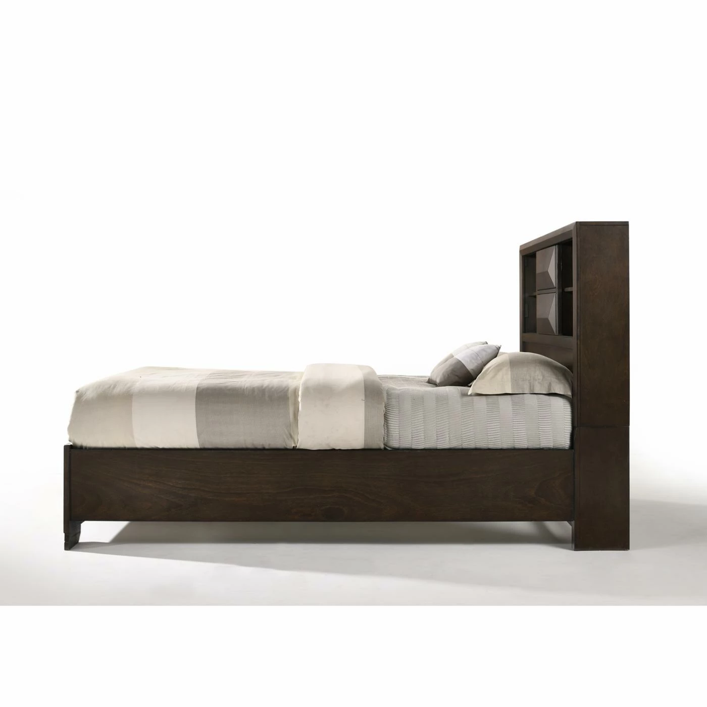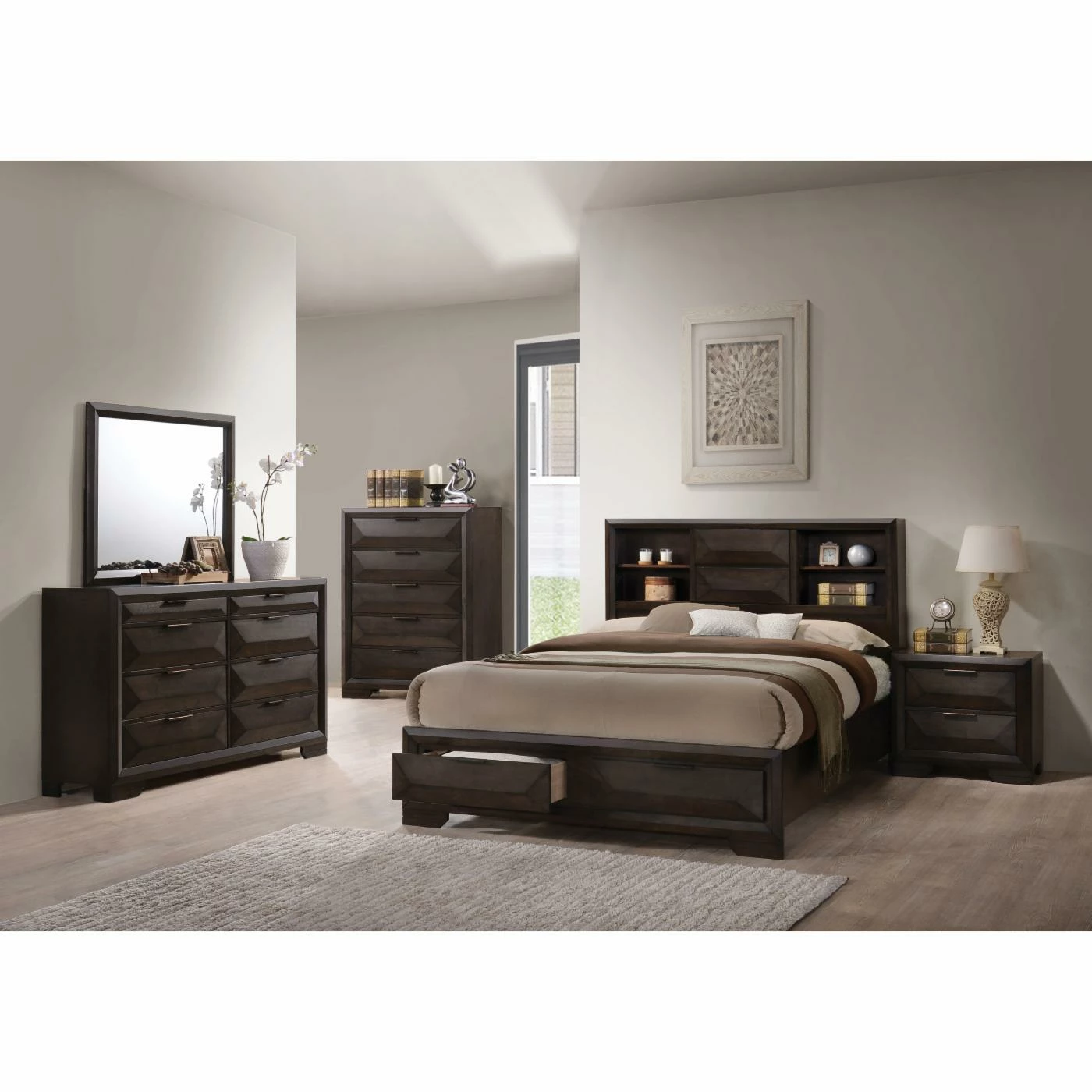 Functional and stylish, the Acme Furniture Merveille Platform Storage Bed features plenty of built-in storage and a clean look with shaped drawer fronts and dark-toned hardware. The frame is constructed from engineered wood and thick rubberwood solids. Four open shelves and two drawers are incorporated into the headboard. The footboard comes with two drawers. Choose from the available sizes to best fit your mattress.
