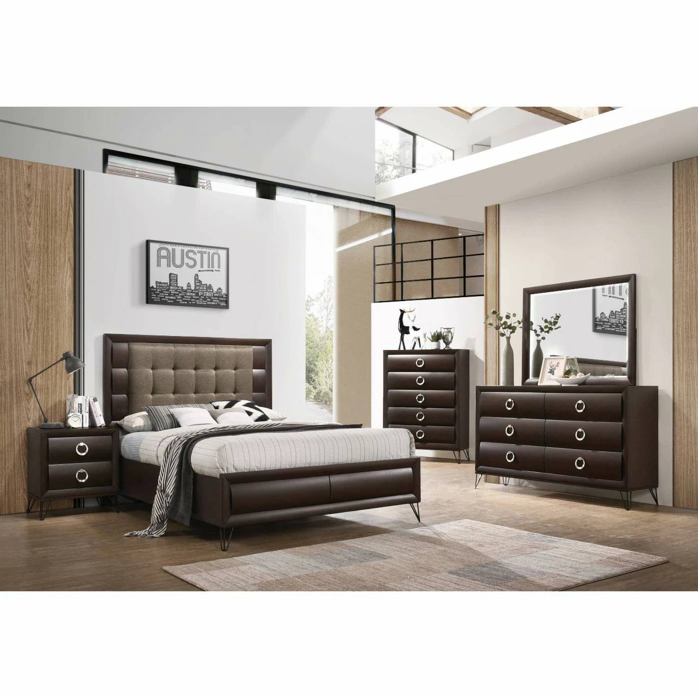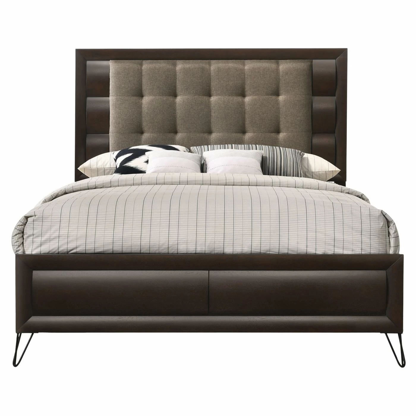 Bring chic, contemporary style to your guest or master bedroom with the Acme Furniture Tablita Low Profile Panel Bed. The headboard features curved wood panels, and the center is upholstered in beige fabric with buttonless tufting. Curved panels in the footboard echo the headboard’s design. The entire piece is in a rich, dark merlot finish. Iron, V-shaped legs give the bed a modern touch.