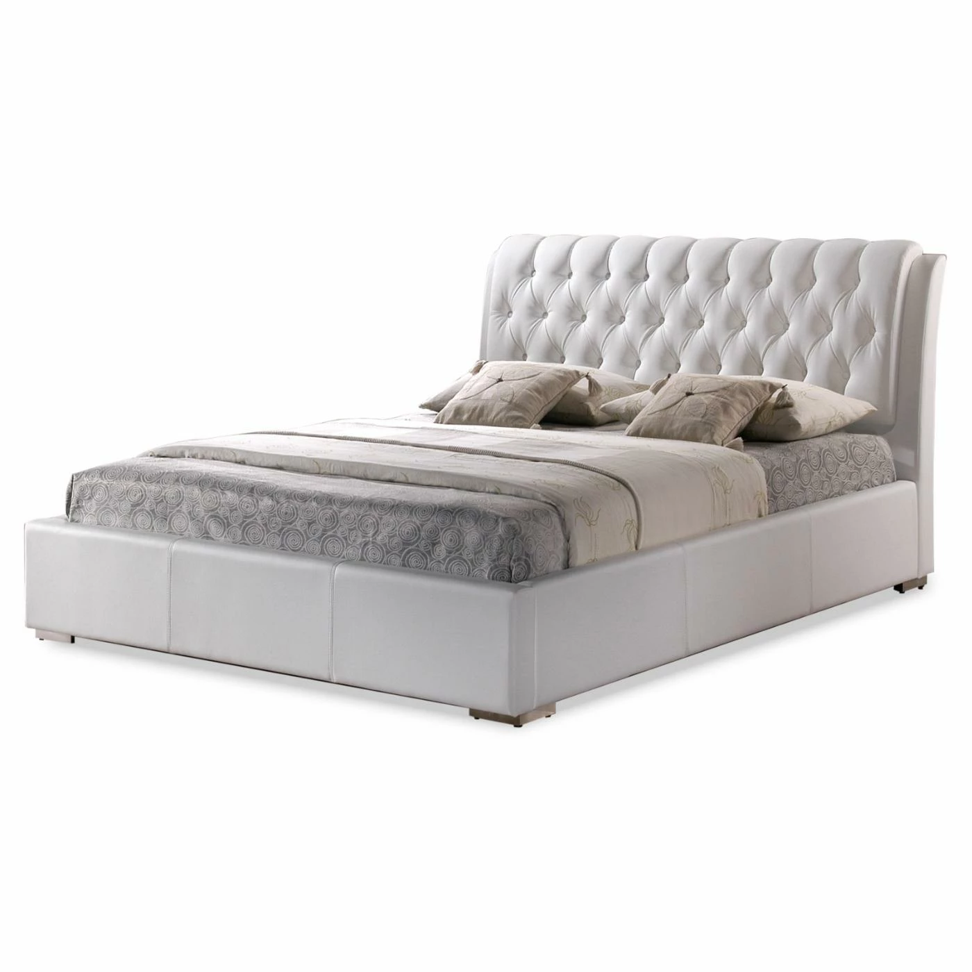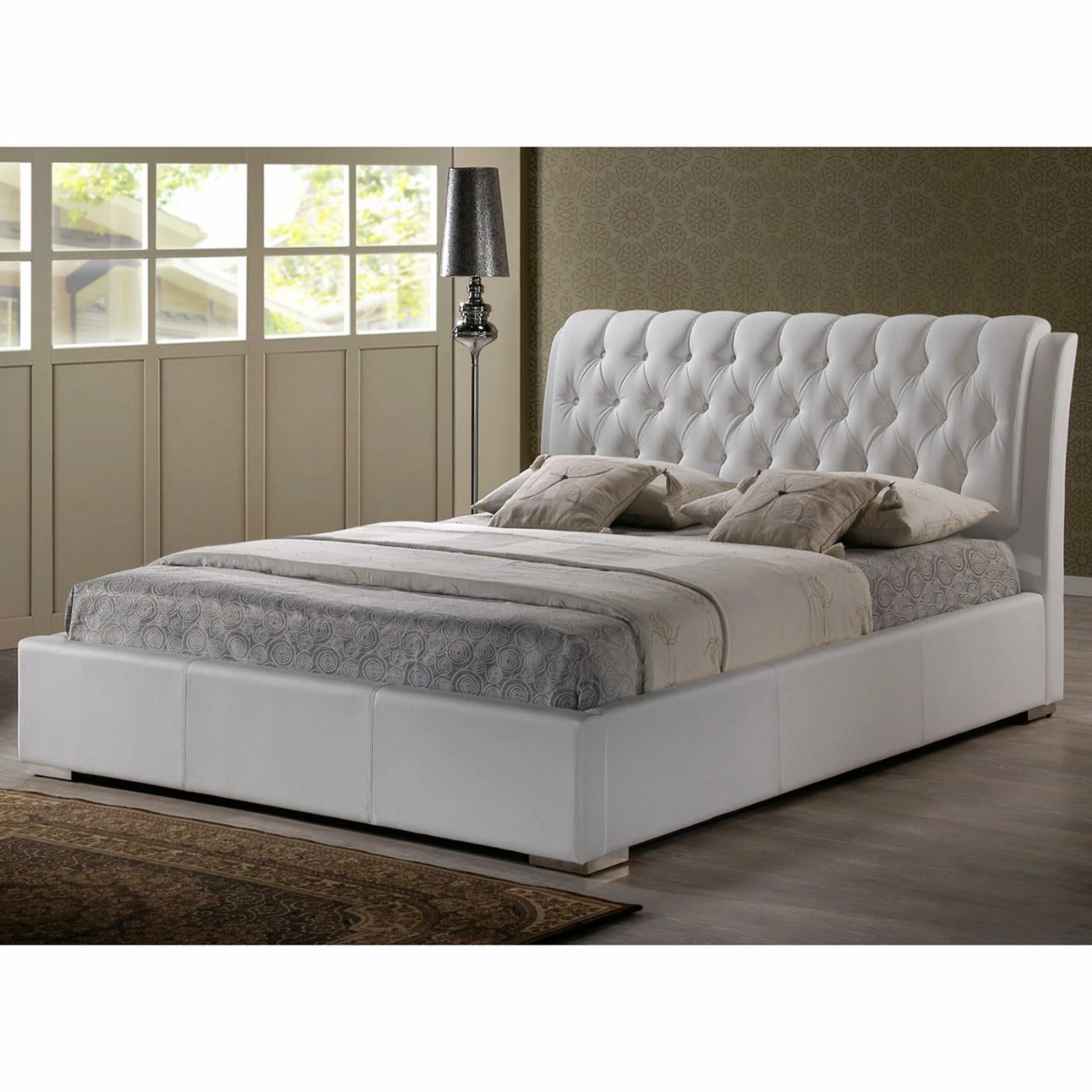 Add a little elegance to bedtime with the Baxton Studio Bianca Upholstered Platform Bed. The polyurethane foam-padded headboard harkens back to vintage glam with button tuft accents on white faux leather upholstery. The frame is crafted of sturdy engineered wood, and wooden slats come included, so no box spring is required. King size.