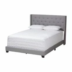 The sleek and elegant Baxton Studio Brady Upholstered Low Profile Bed adds modern beauty to any bedroom. Featuring a straight, winged headboard with nailhead trim and button tufting, this bed updates and elevates the style of your master or guest bedroom. Made to maintain its integrity throughout the years, this low profile bed boasts a rubber wood and poplar frame thatβs strong and durable. Polyester upholstery comes in your choice of available colors to complement any decor. Select from available sizes.